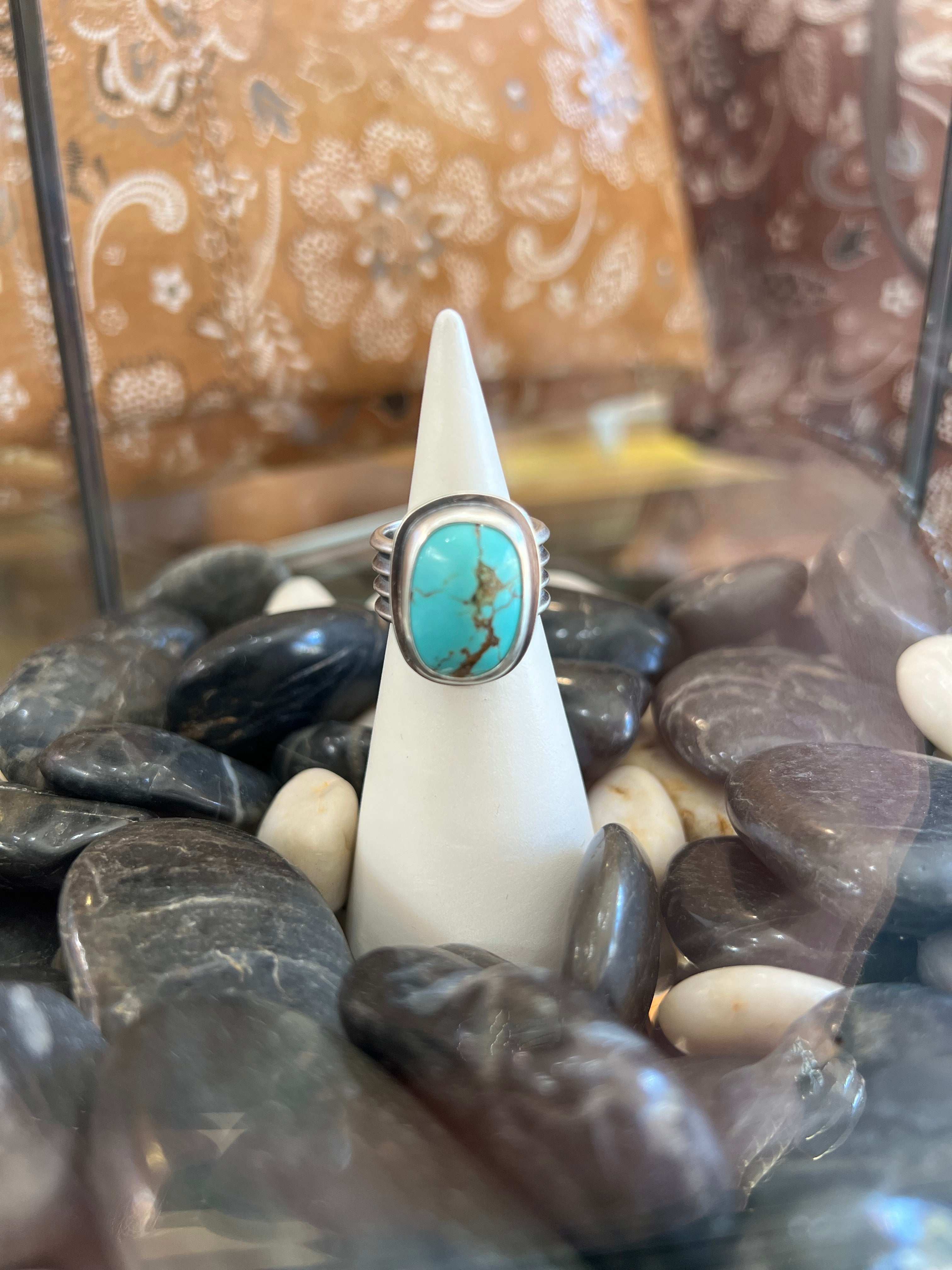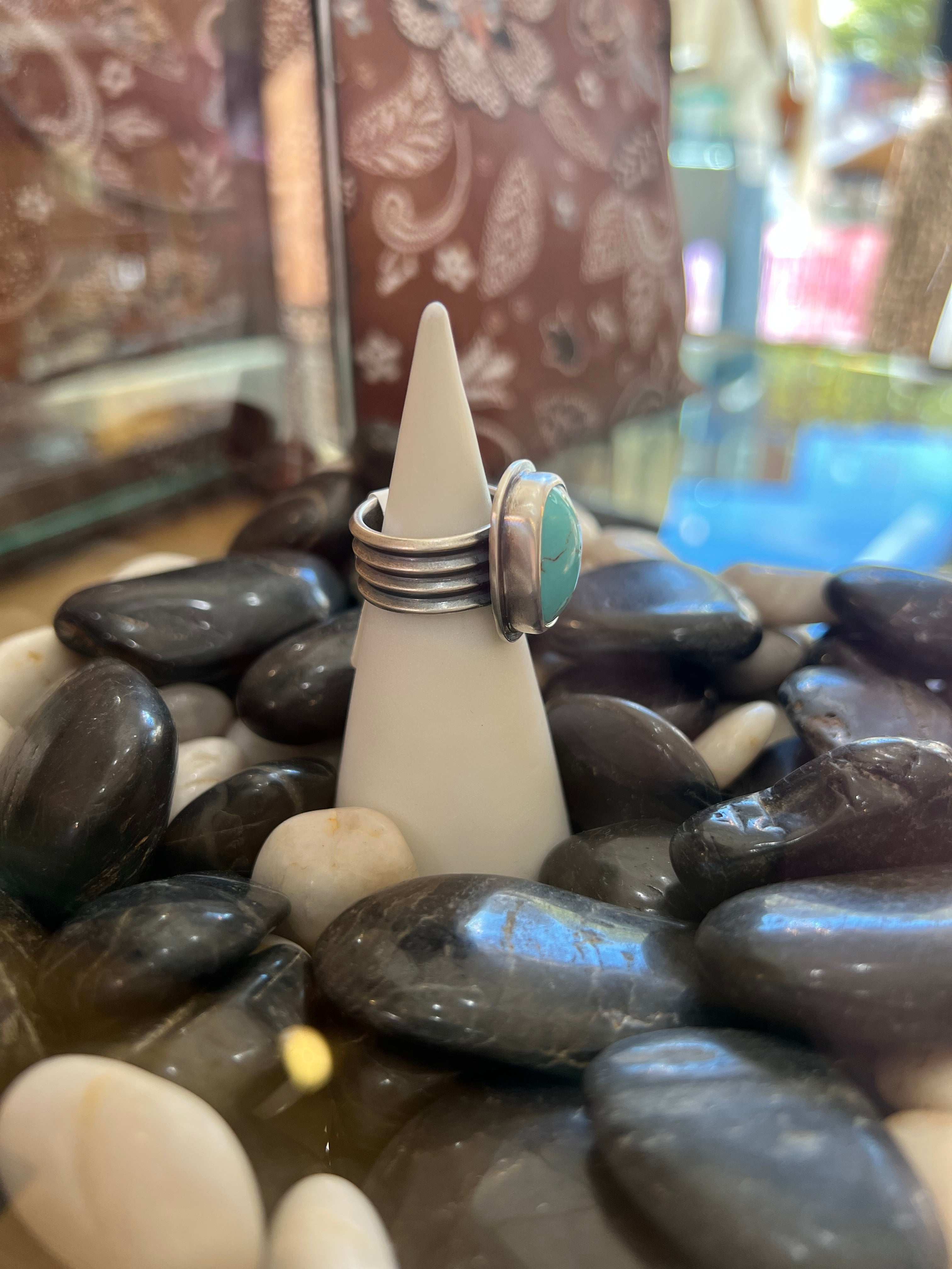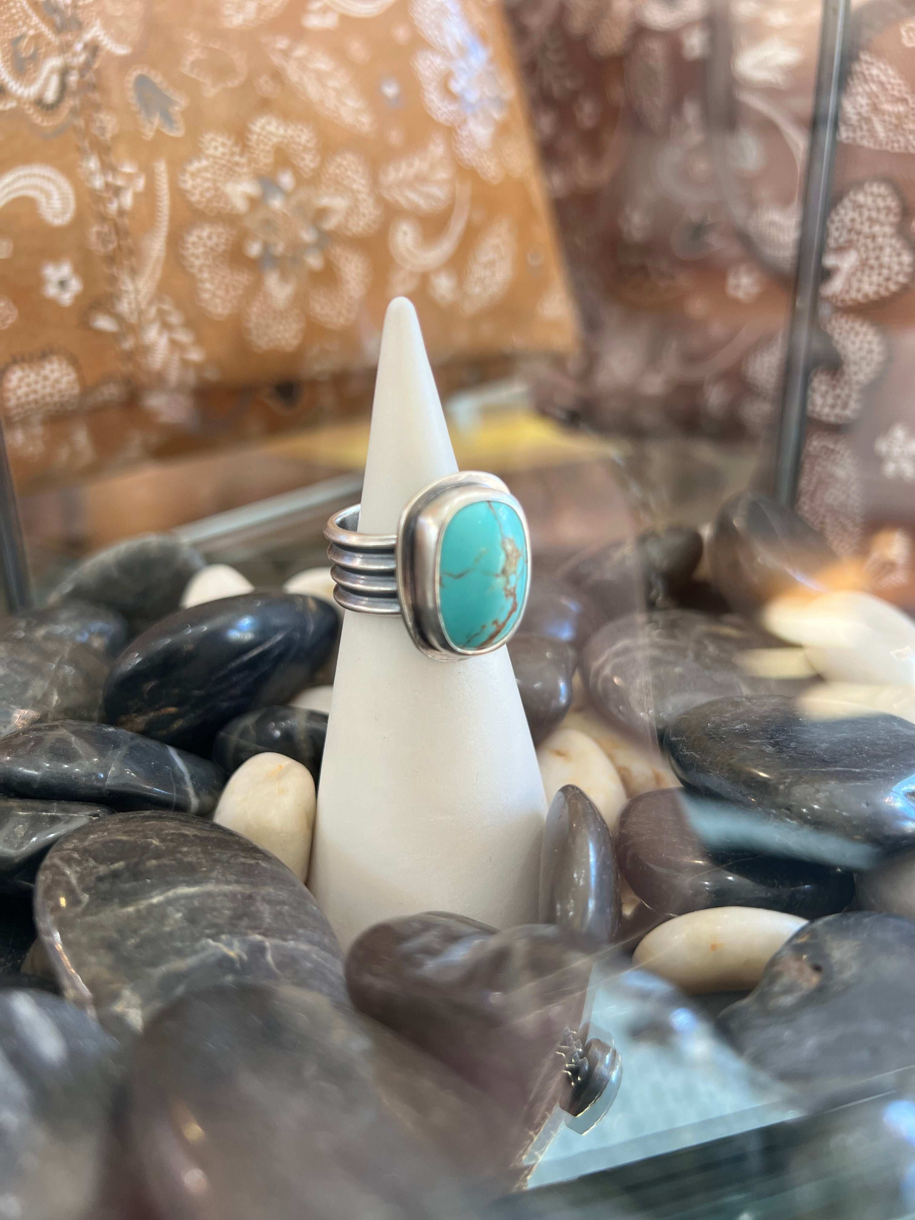 Turquoise in a sterling silver setting with a unique stacked silver band.