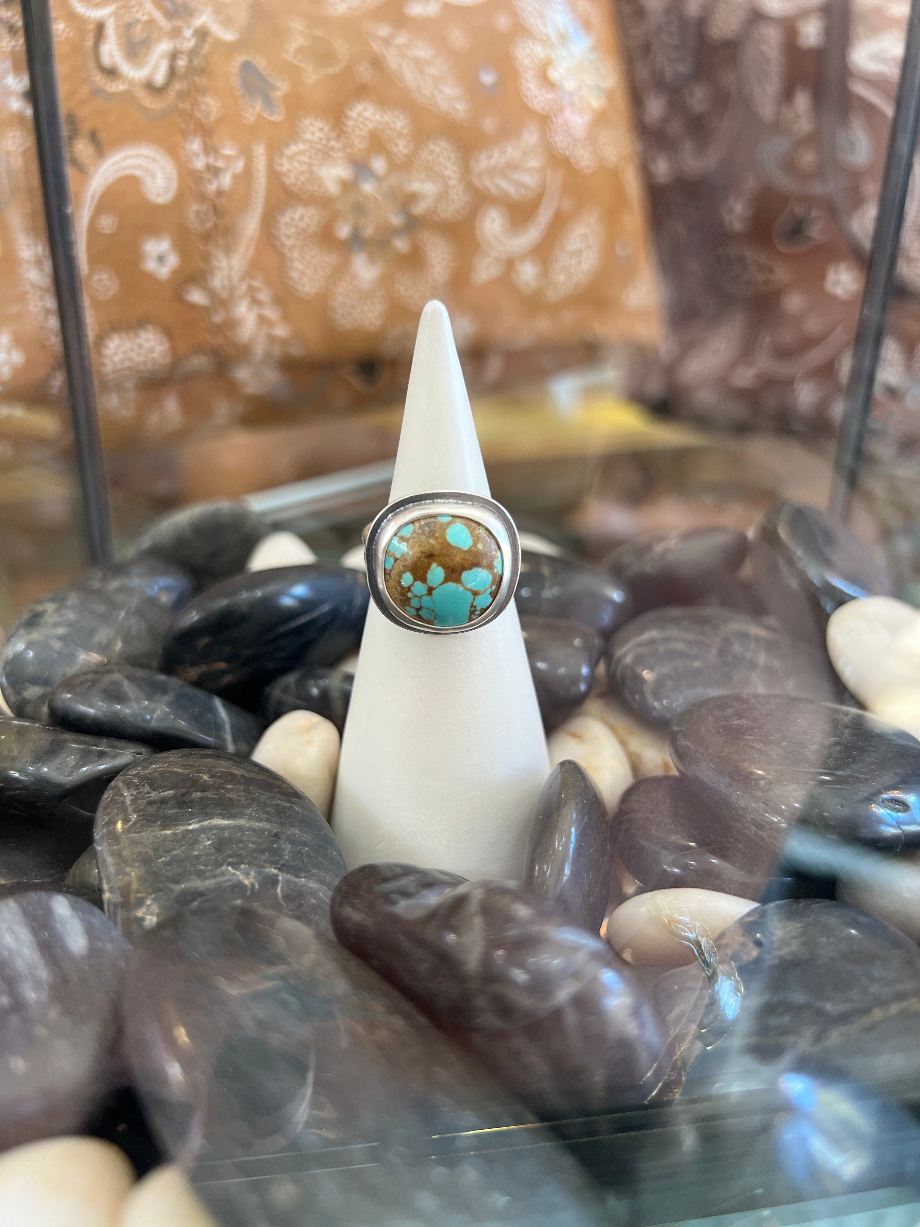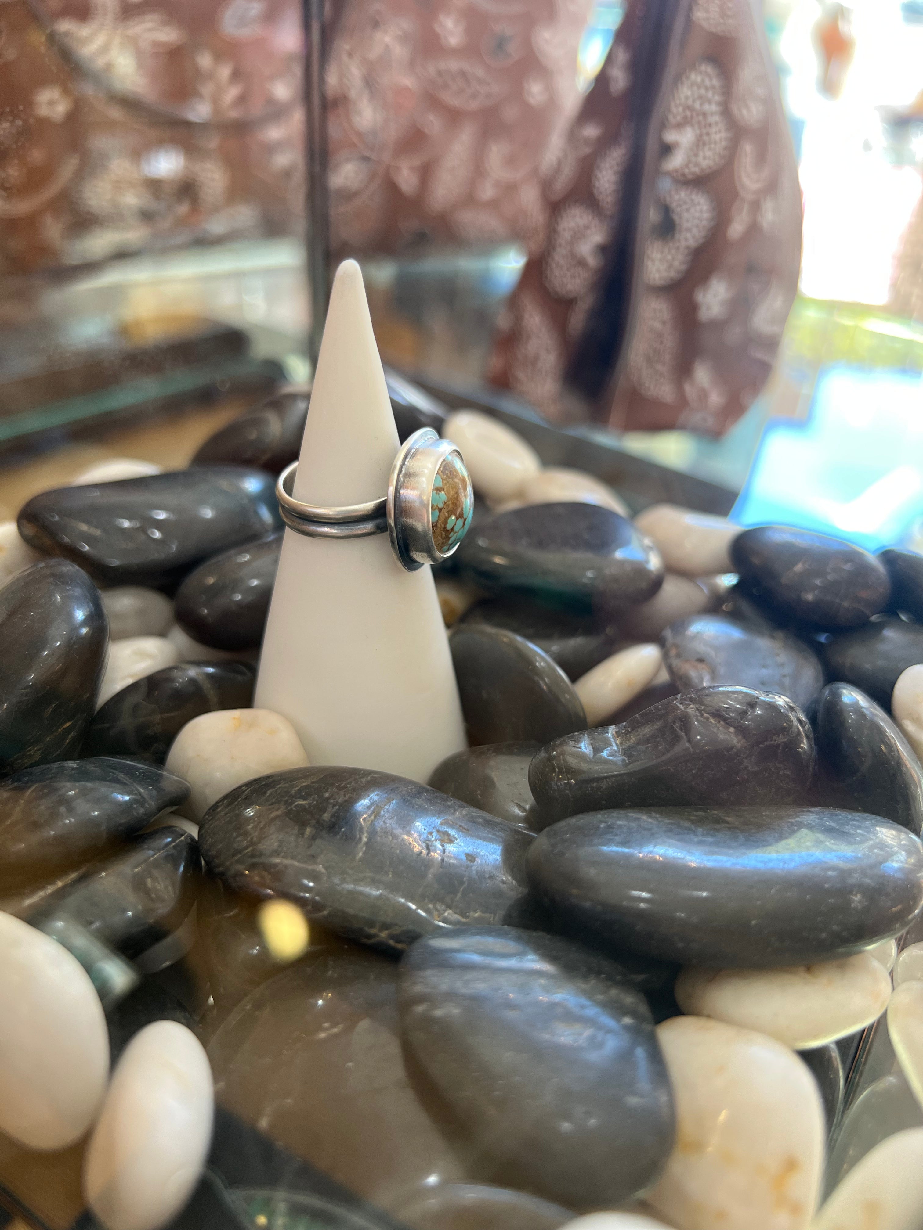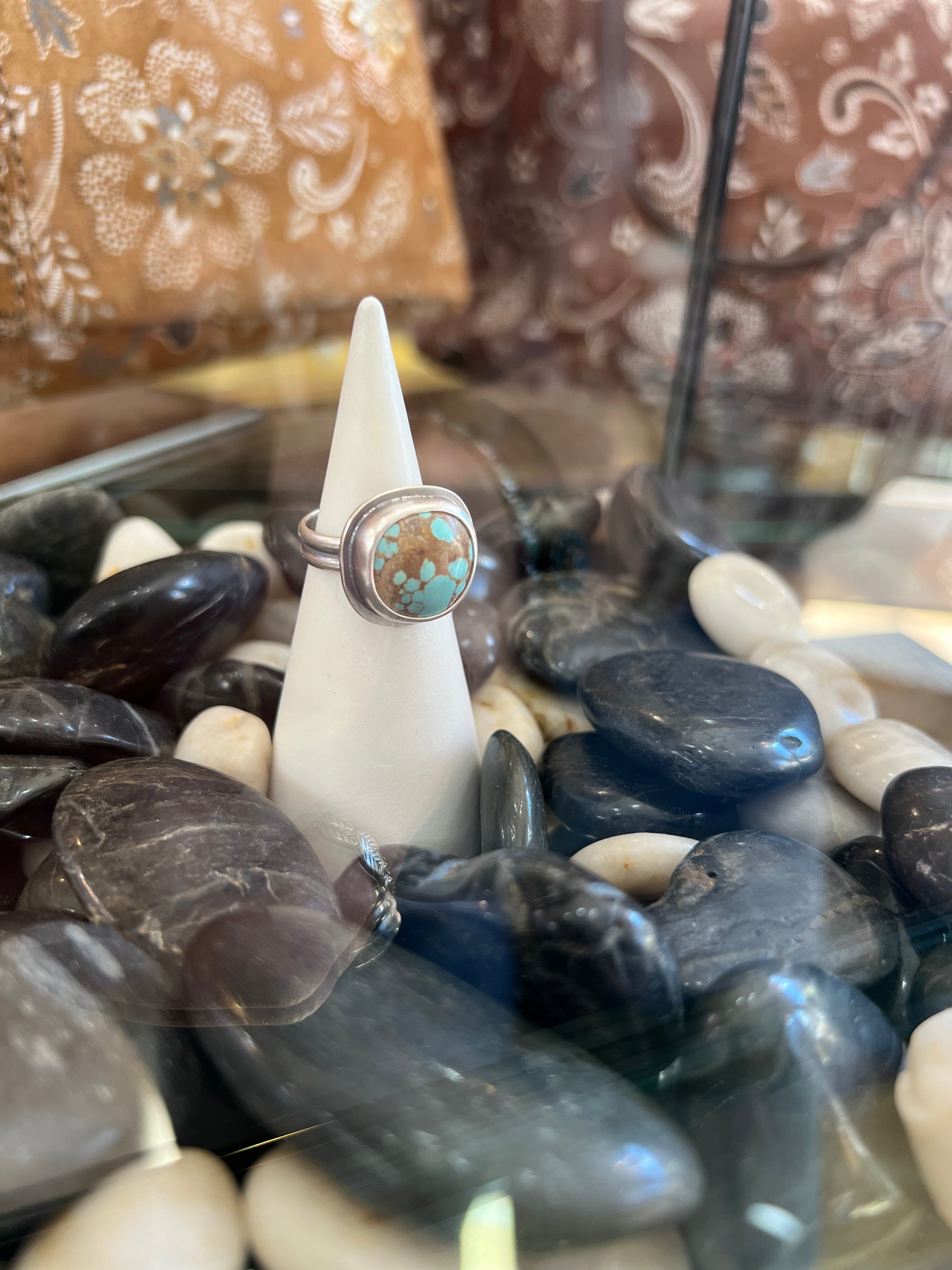 Turquoise in a sterling silver setting with a unique stacked silver band.