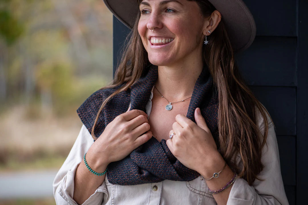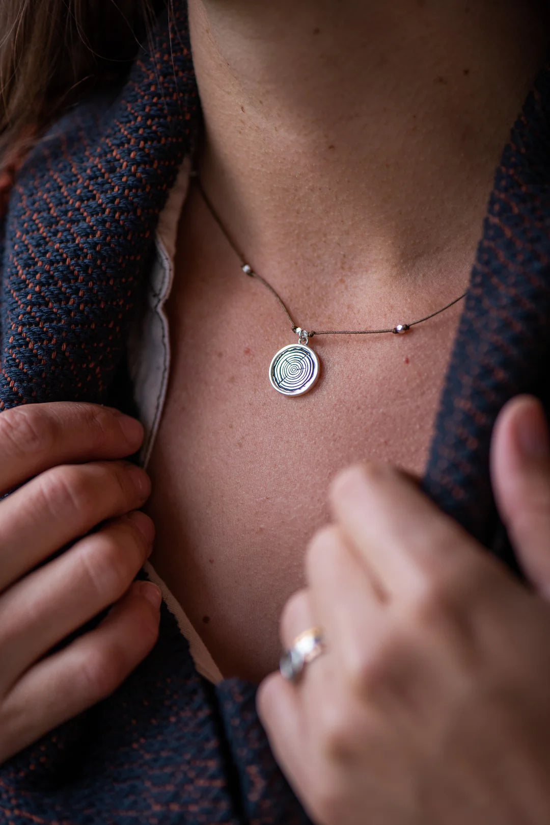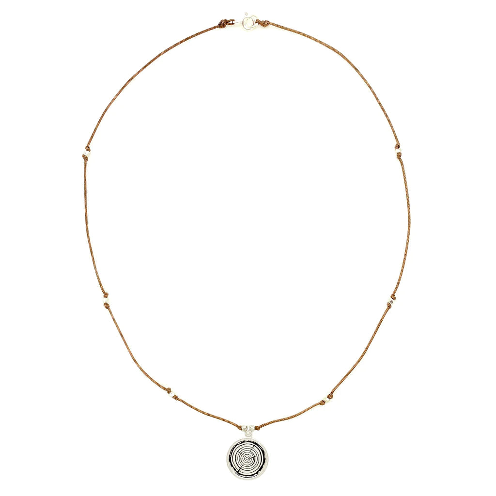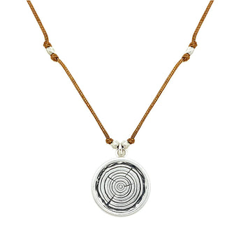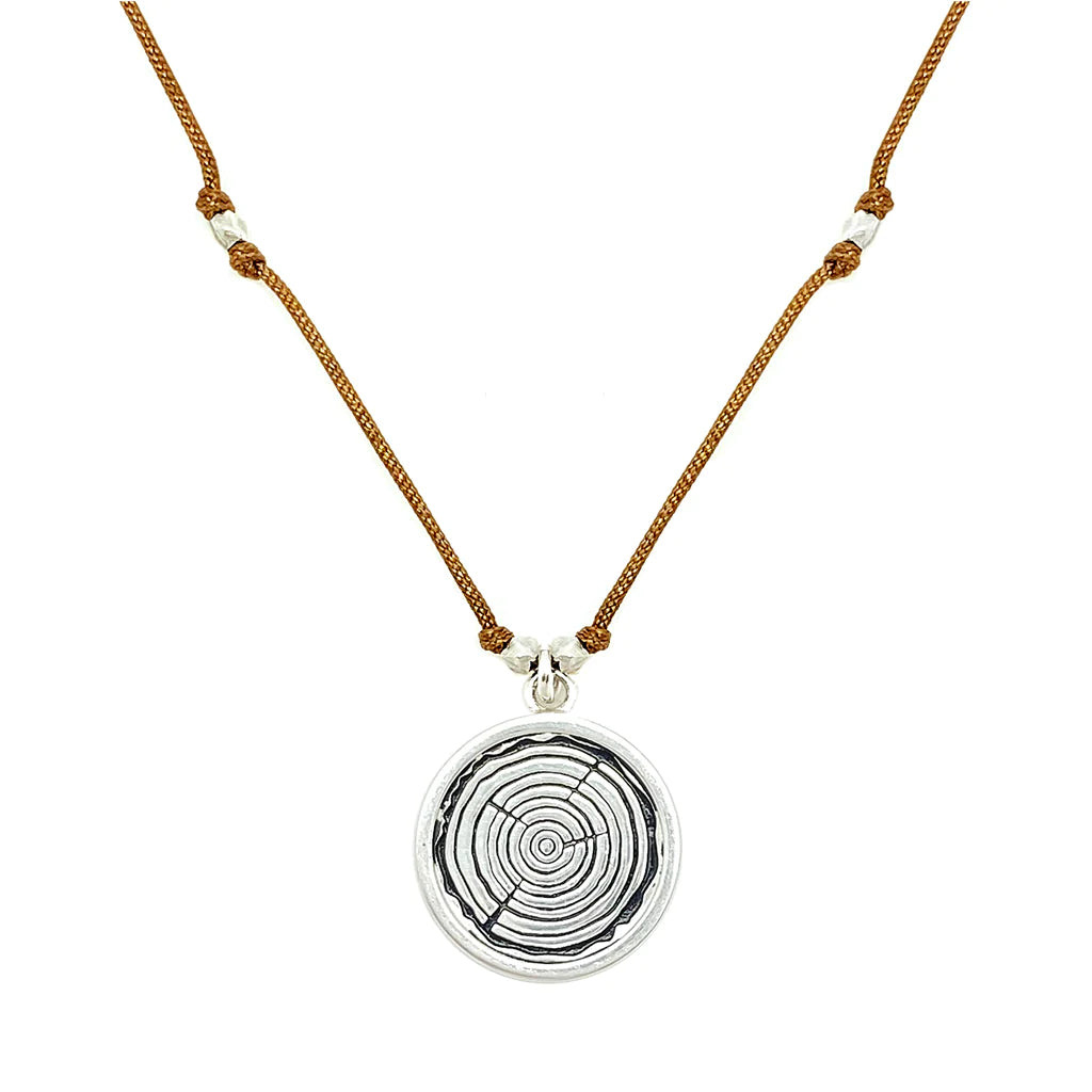 We see the rings of a tree as a reminder to embrace age and all the growth that comes with it. We love this motif as it shows the journey of a life well lived with bountiful records of seasons upon seasons of living and growing. Beautiful sterling silver pendant has etched and oxidized tree ring details. Water friendly nylon cord is adorned with silver accent beads throughout. Available in Espresso cord, 16” length.