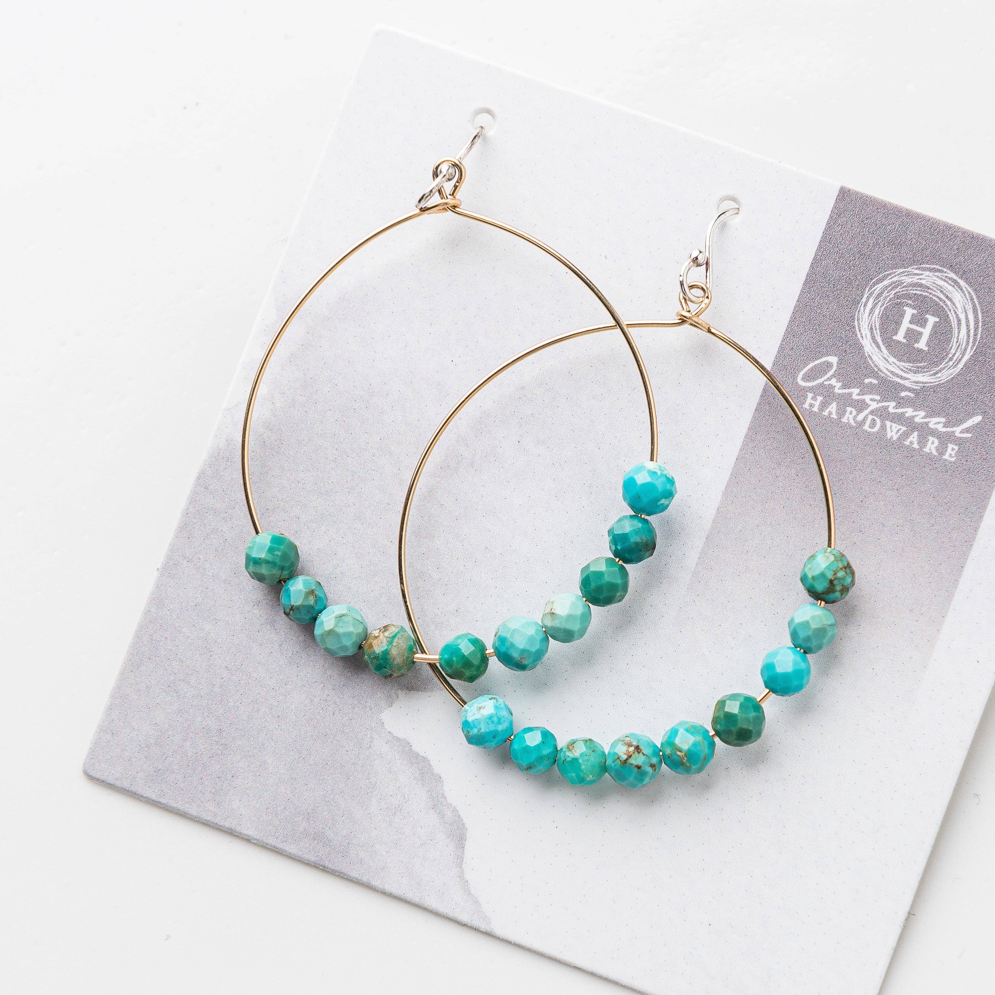 Faceted turquoise stones swing elegantly from 14k gold filled hoops, secured by sterling silver earring wires.