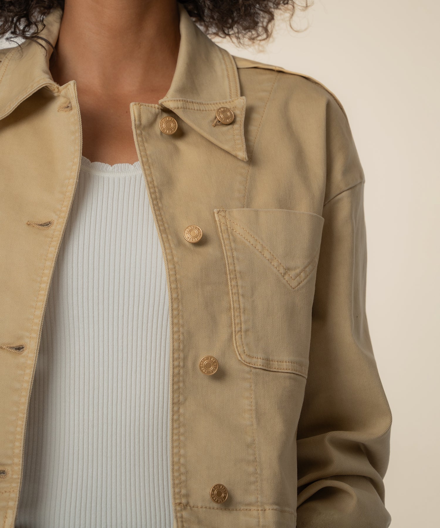 - Refresh your wardrobe with this cashew color jacket, the perfect layer for spring. Made from soft, stretchy material, it offers comfortable movement with a polished look. Designed with a classic button front, functional front pocket, and a stylish fold up collar corner with button, this versatile jacket is easy to dress up or down. Lightweight yet structured, it’s a must-have piece for effortless everyday layering.
