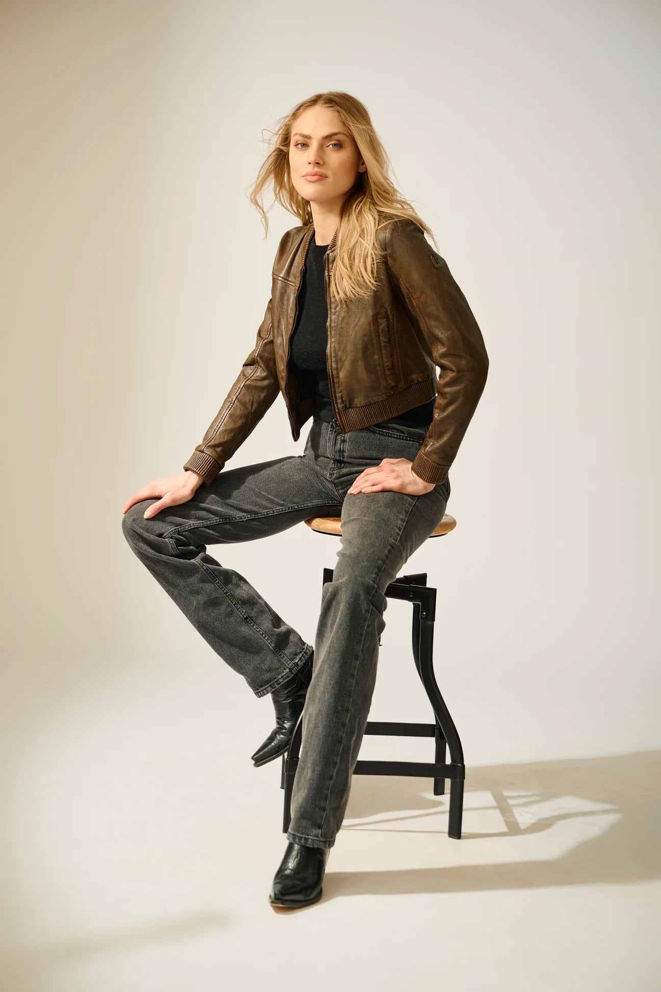 Kamaryn redefines the classic bomber with a cropped cut and rich brown marble wash. Ribbed cuffs and waistband add a secure fit, blending effortless style with everyday comfort.