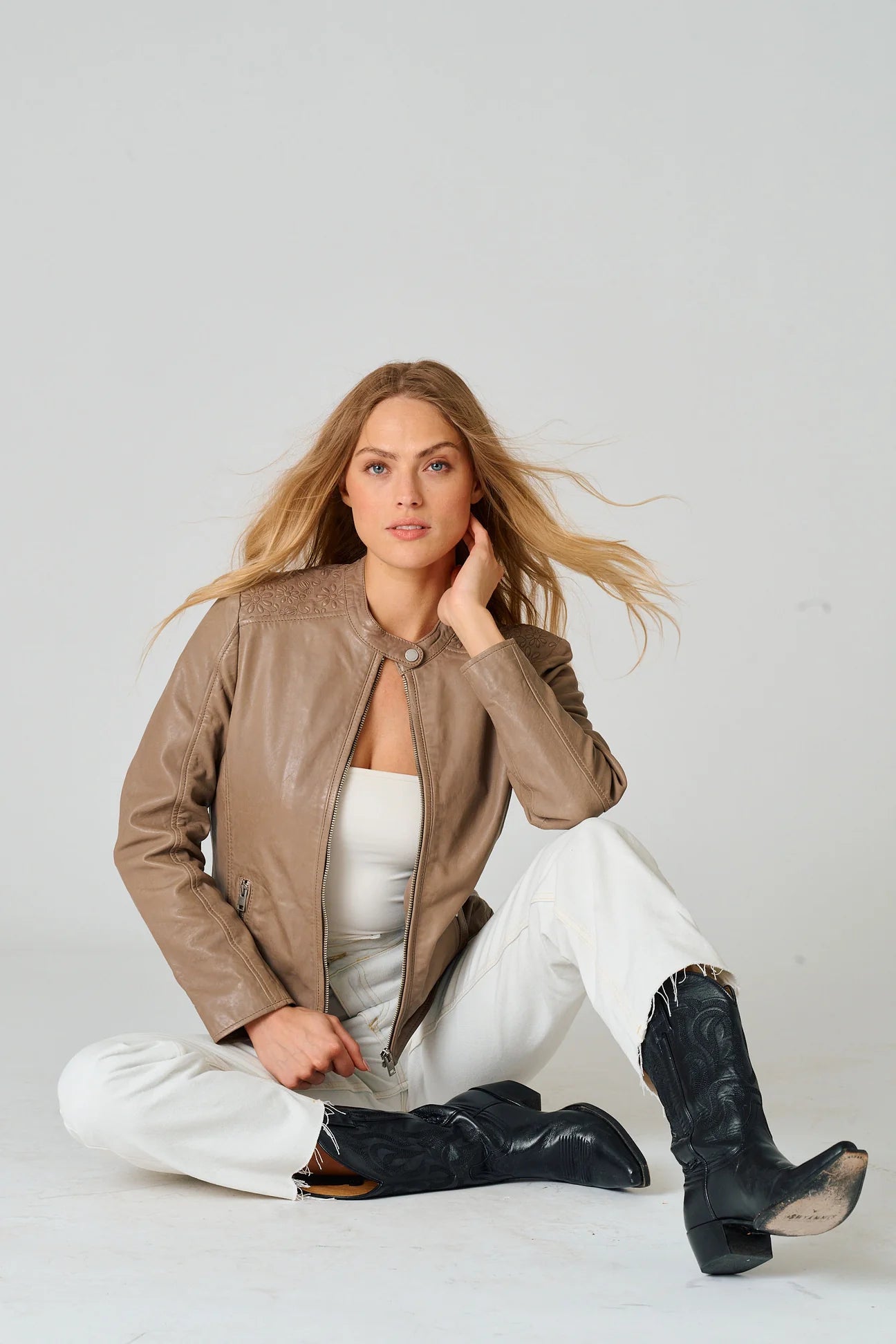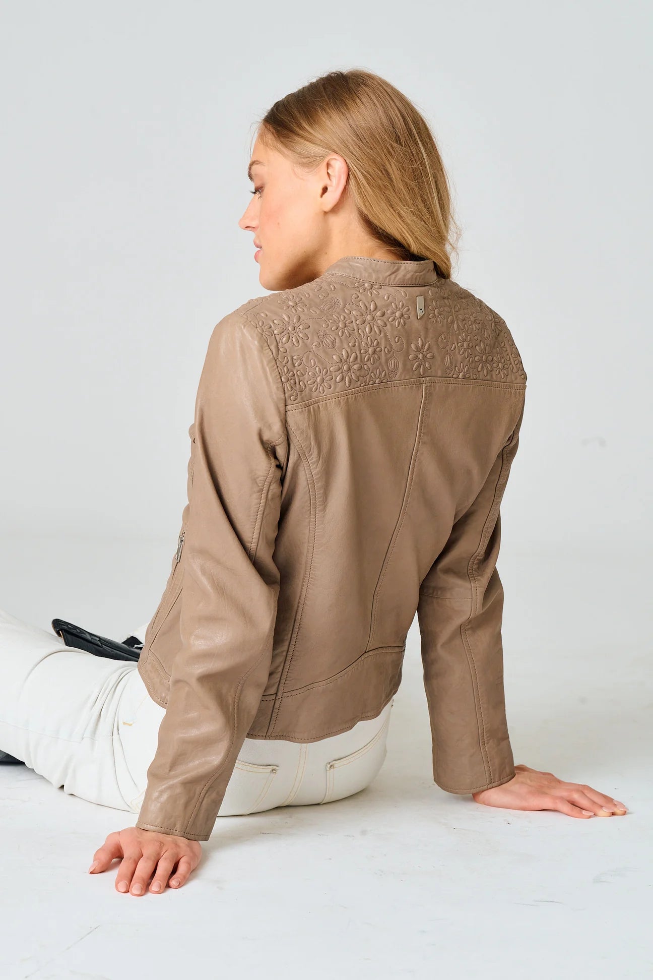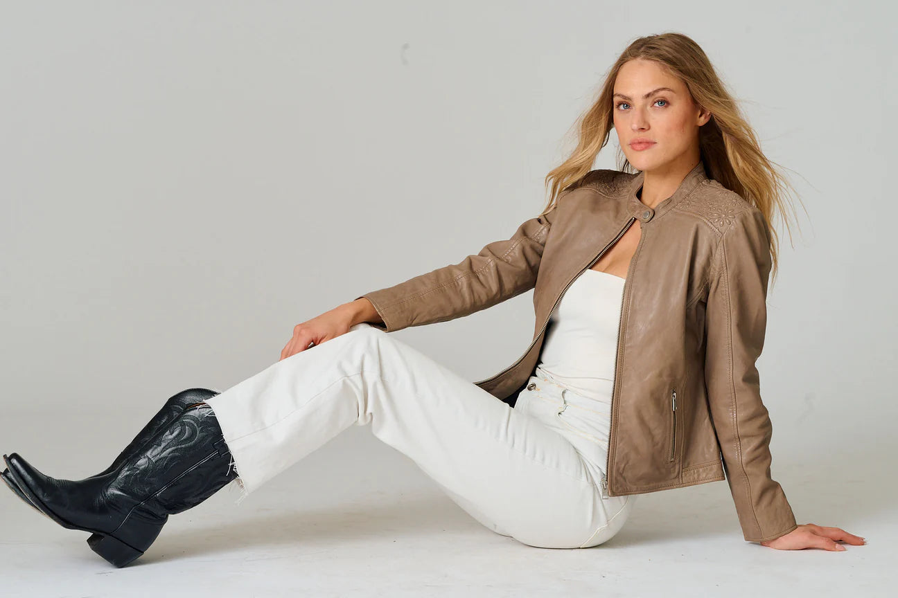 The Lily Leather Jacket elevates a classic silhouette with embossed floral detailing across the shoulders. A refined statement piece that blends subtle artistry with timeless leather style.