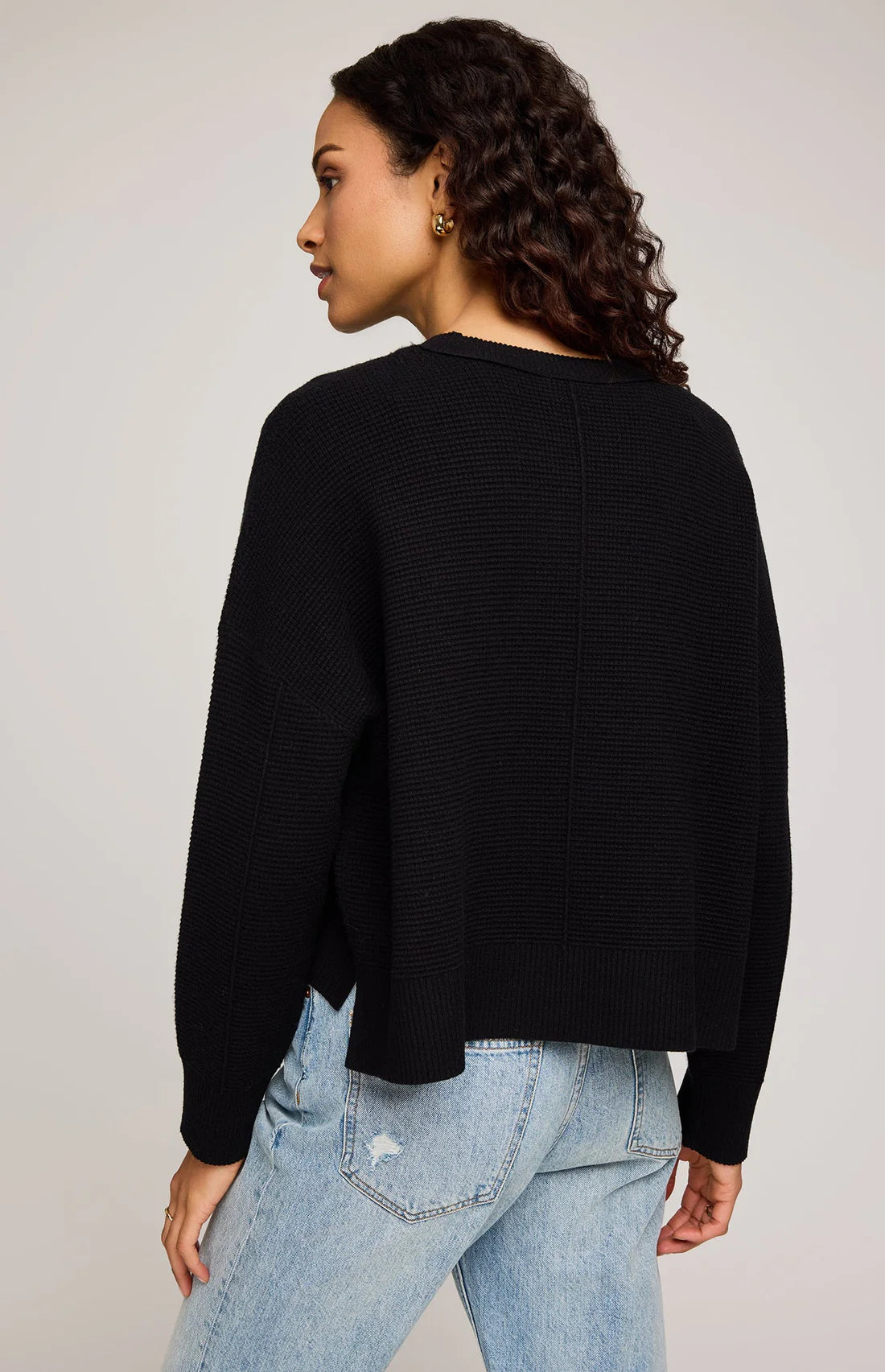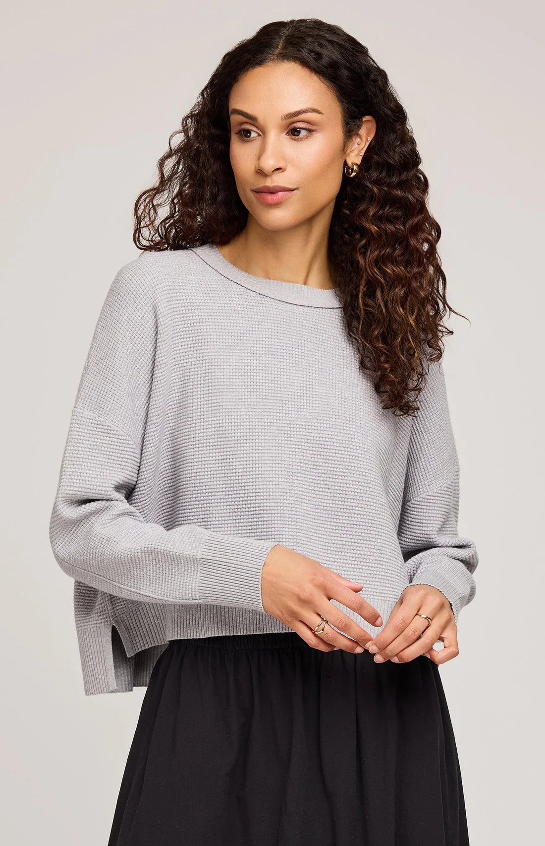 The Axel sweater is made of a soft yarn in a waffle knit pattern. Features include a crew neckline, seam details, and side slits.
