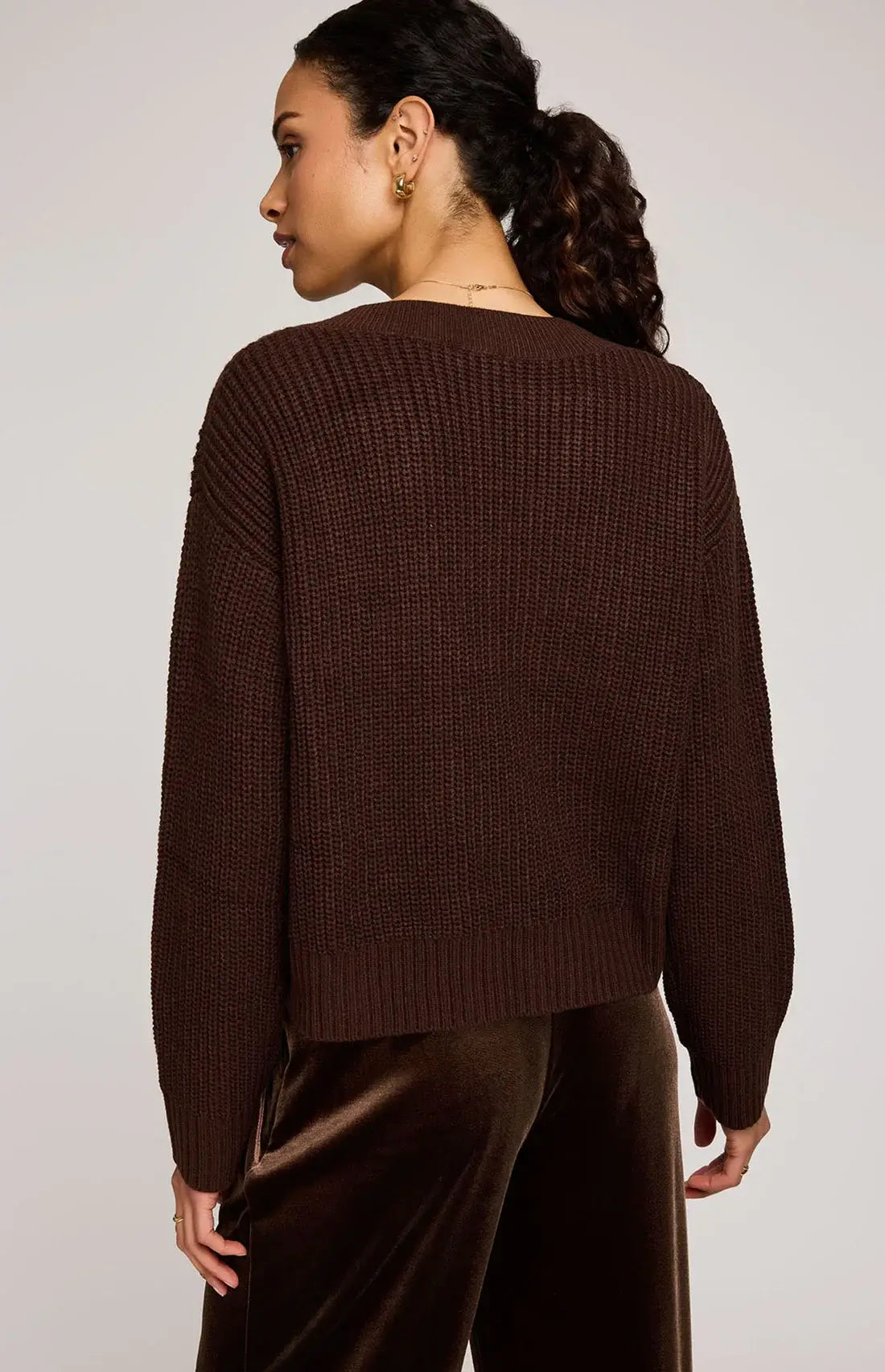 The Marcie sweater is made of a soft yarn. Features include a v-neckline and cable knit details throughout.