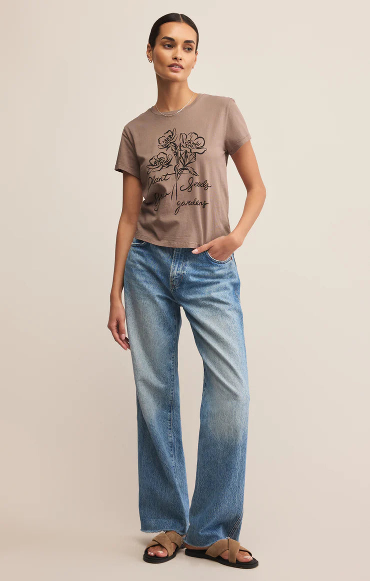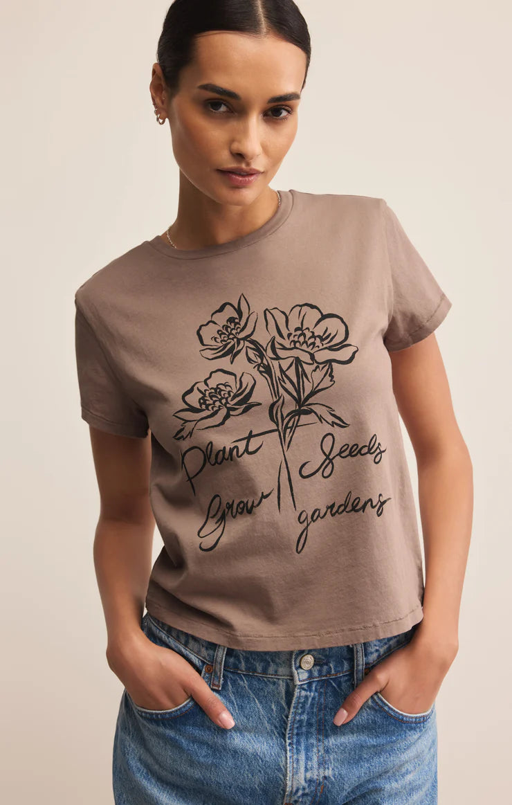 This short sleeve crew neck tee features a “Plant Seeds, Grow Gardens” floral graphic that adds a playful, thoughtful touch. Made from soft-hand cotton jersey with an enzyme wash, it has a relaxed fit that feels easy, comfy, and ready for wherever the day leads.