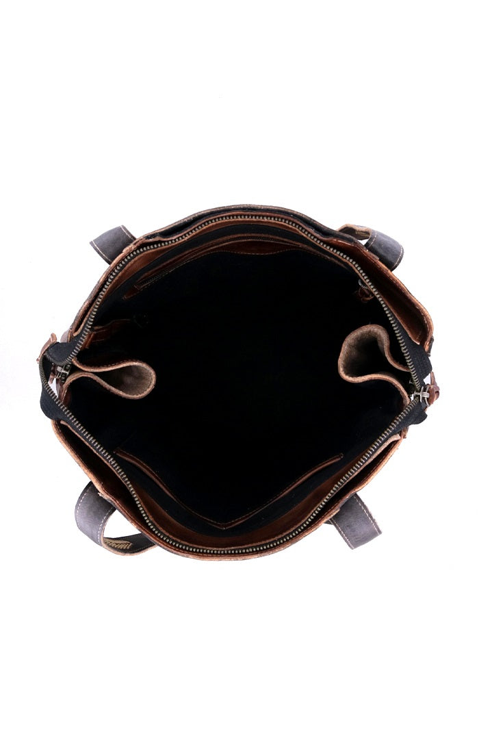 - 12 in. H, 15 in. W, 5.5 in. D , decorative shoulder leather strap