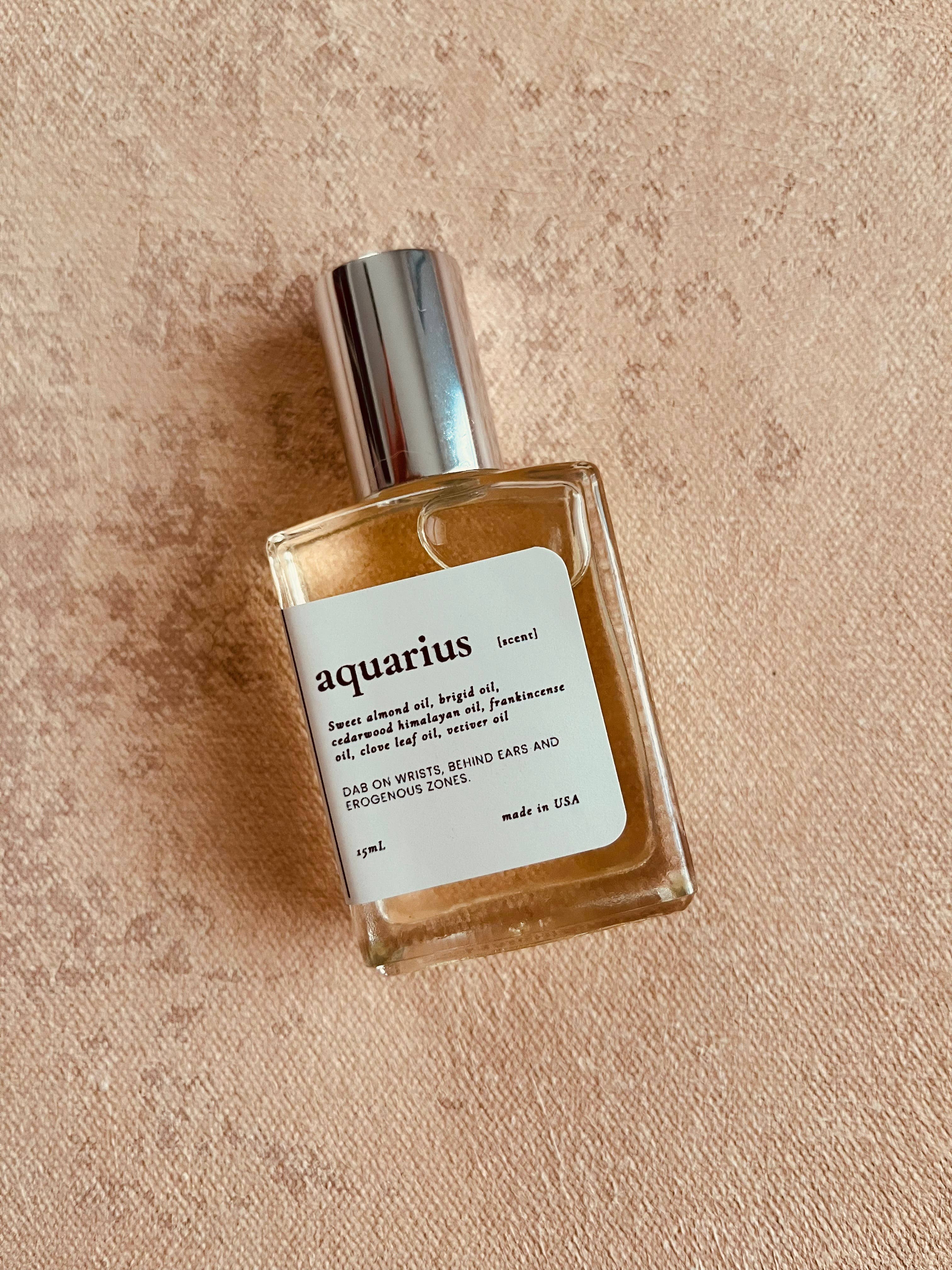 AQUARIUS PARFUM is a warm, yet exotic, fragrance specifically curated for the radiant, social justice warrior of the Zodiac: Aquarius. Typically defined as being unruly.This sensual aroma will calm Aries while also complimenting their playful personality. SACRED PRACTICE Dab on wrists, behind the ears, and on erogenous zones. INGREDIENTS Sweet almond oil, brigid oil, cedar wood Himalayan oil, frankincense oil, clove leaf oil, vetiver oil