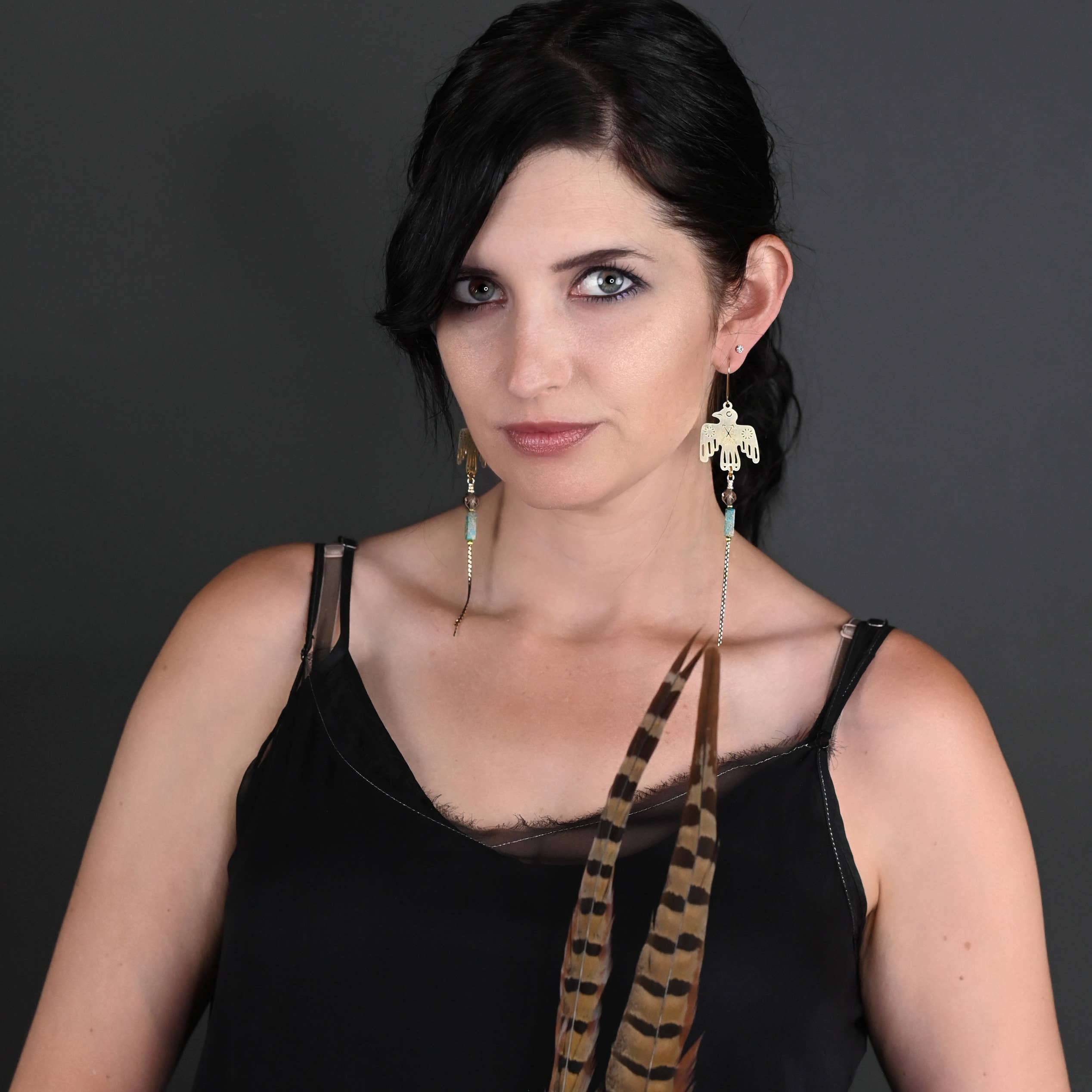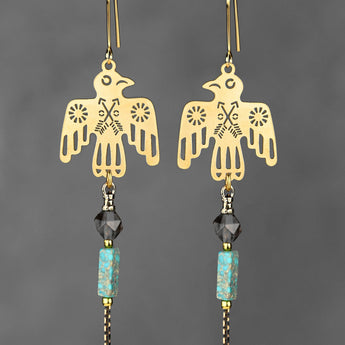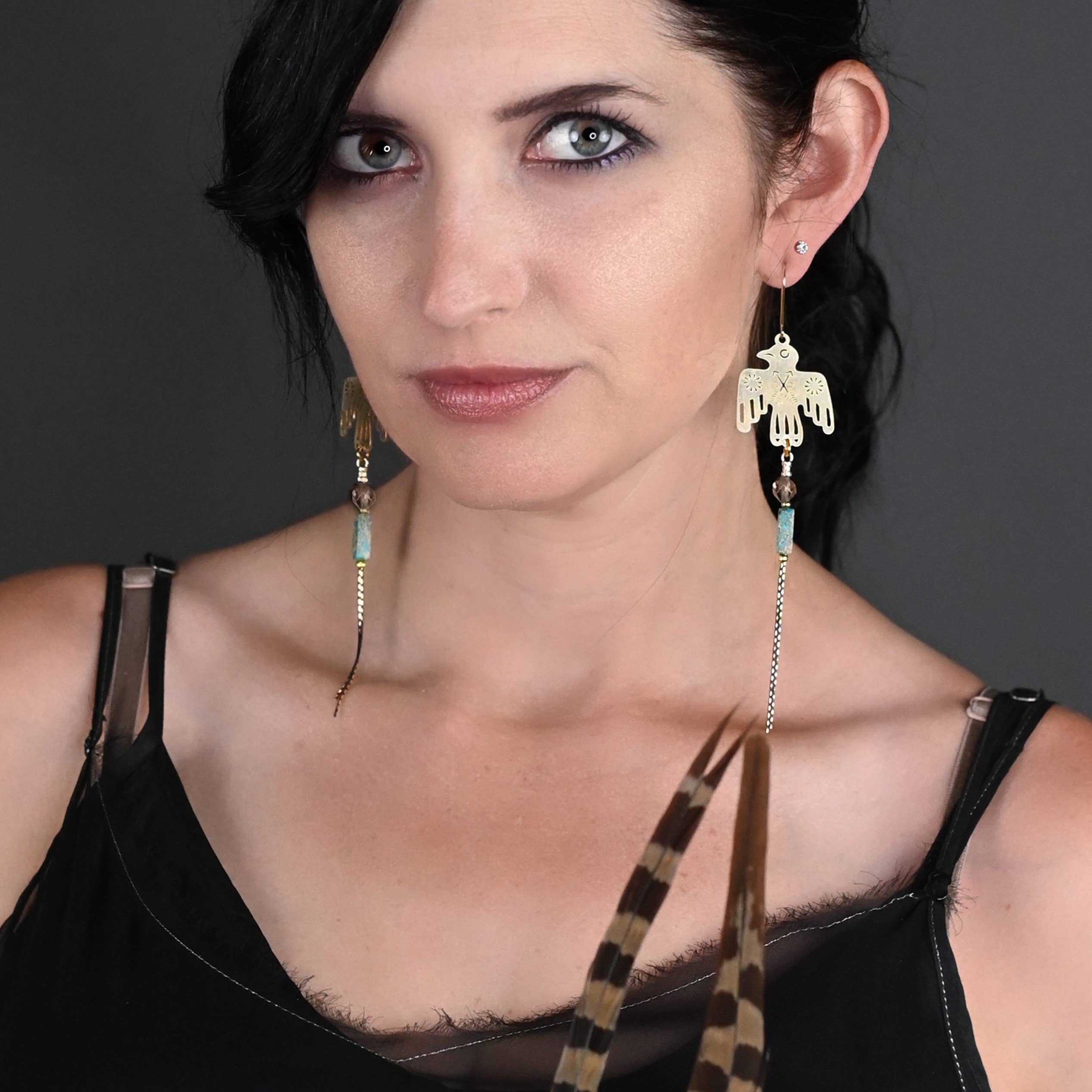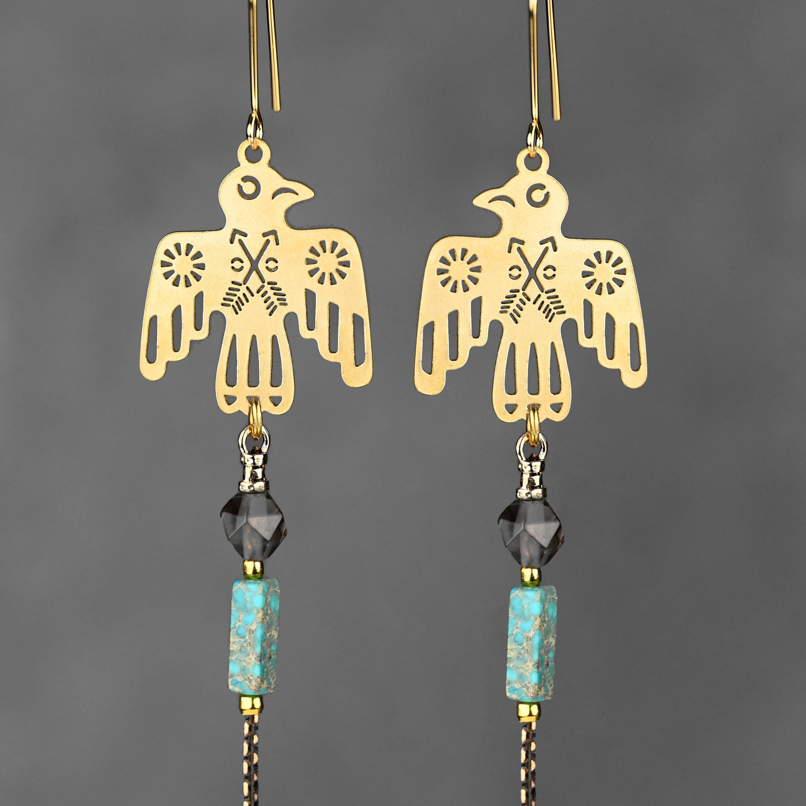 These are great earrings that feature brass Thunderbirds and the option of adding a delicate Black and Gold Tassel with Turquoise Jasper and a Smoky Quartz Stone that are suspended on the chain.