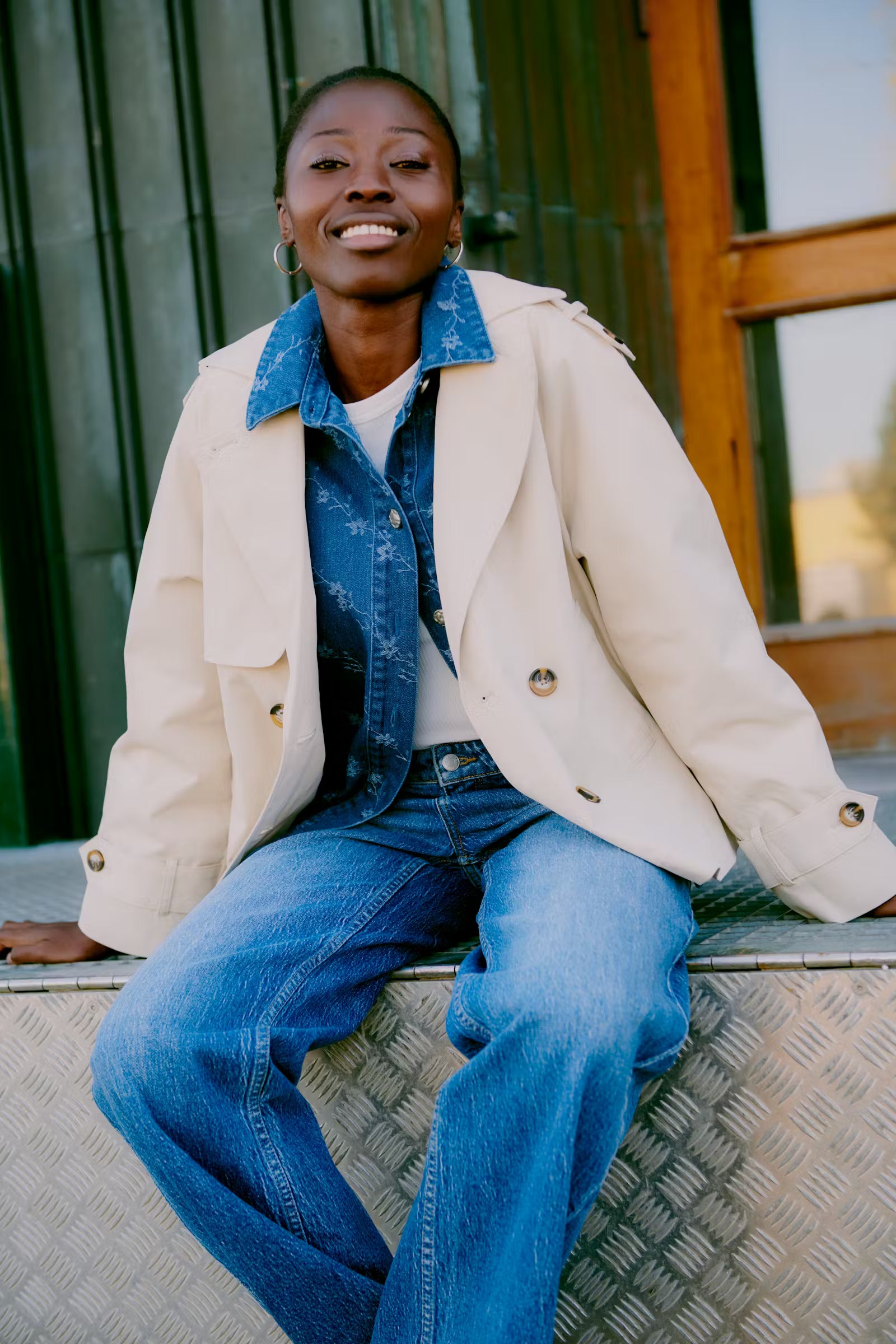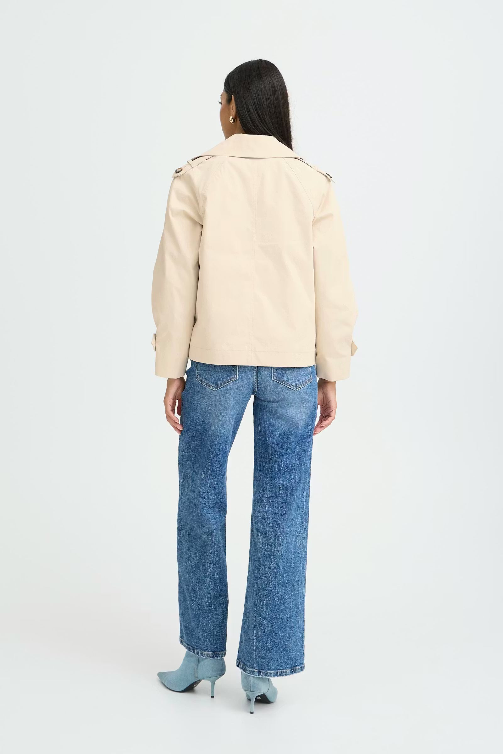 Double-breasted jacket with a boxy fit and structured shoulders. Features a wide notched lapel, epaulettes at the shoulders, and adjustable strap details at the cuffs. Side pockets and large front buttons complete the look.