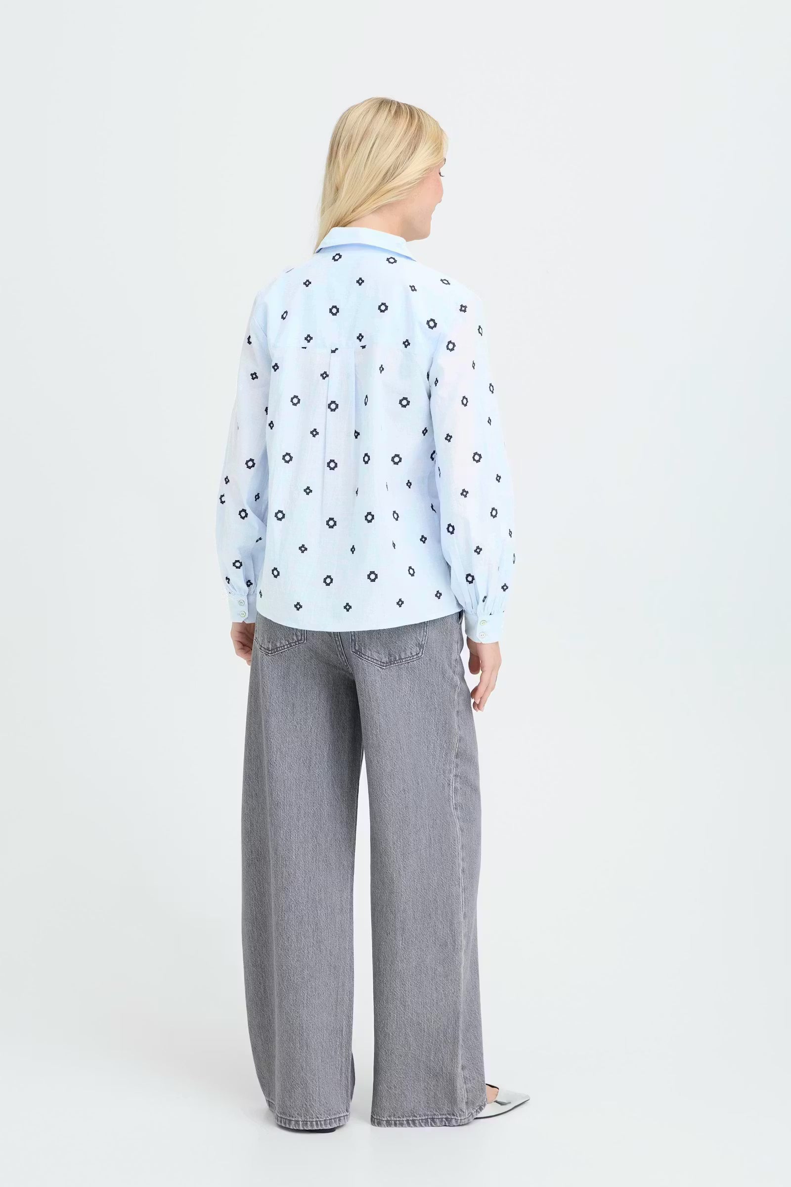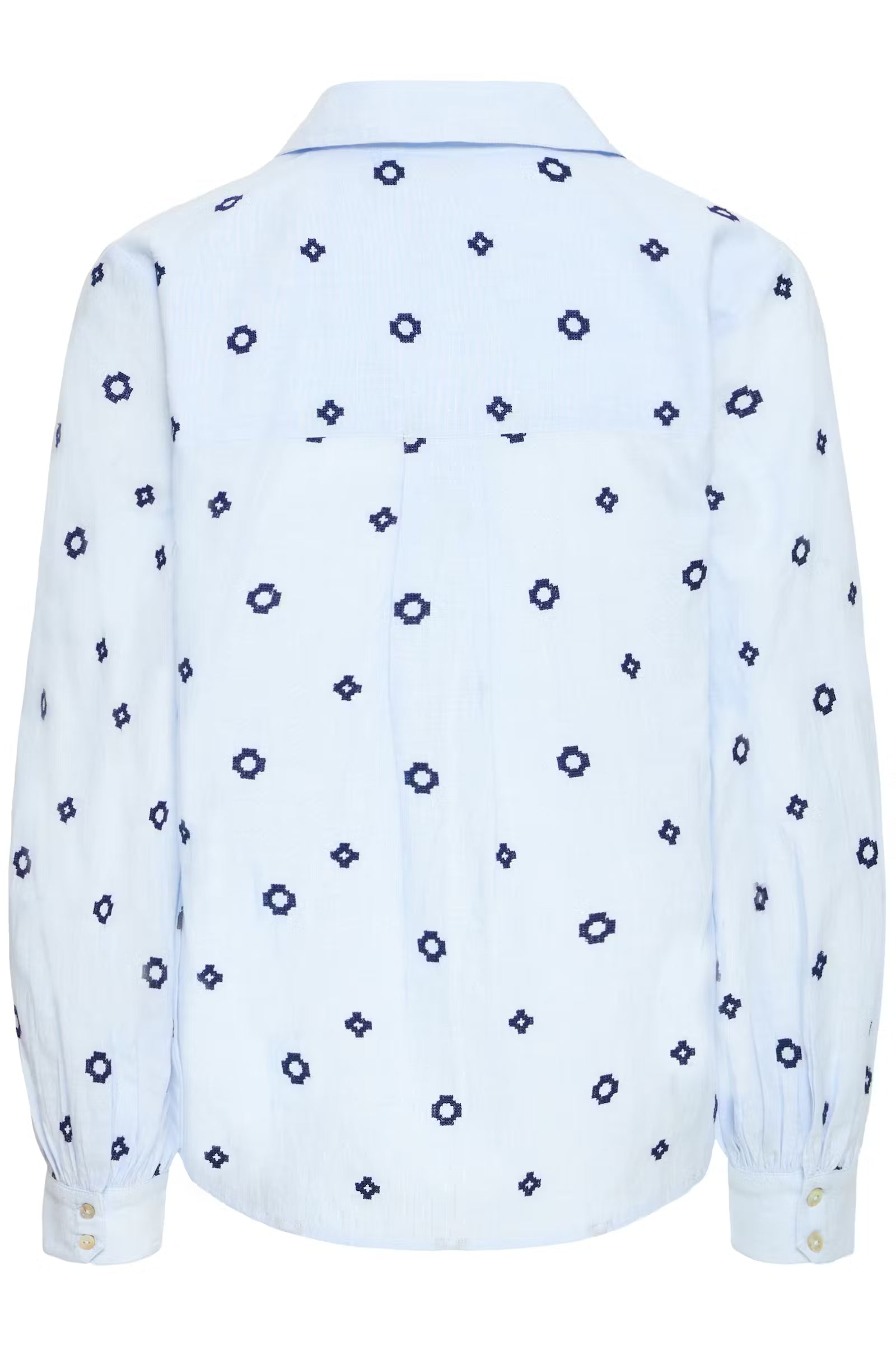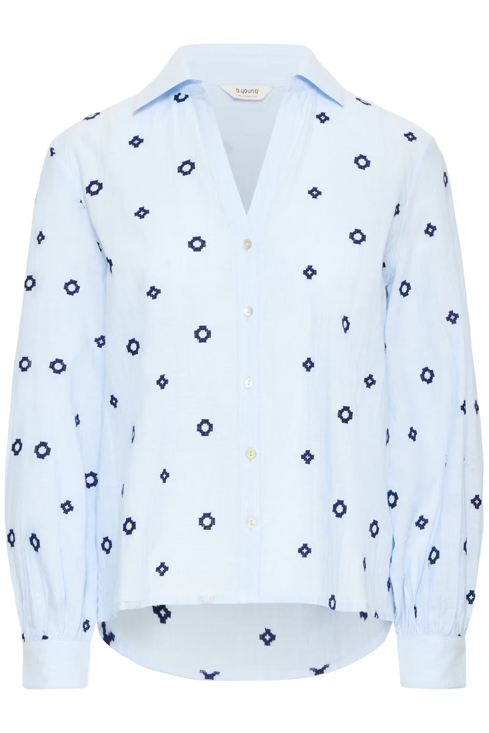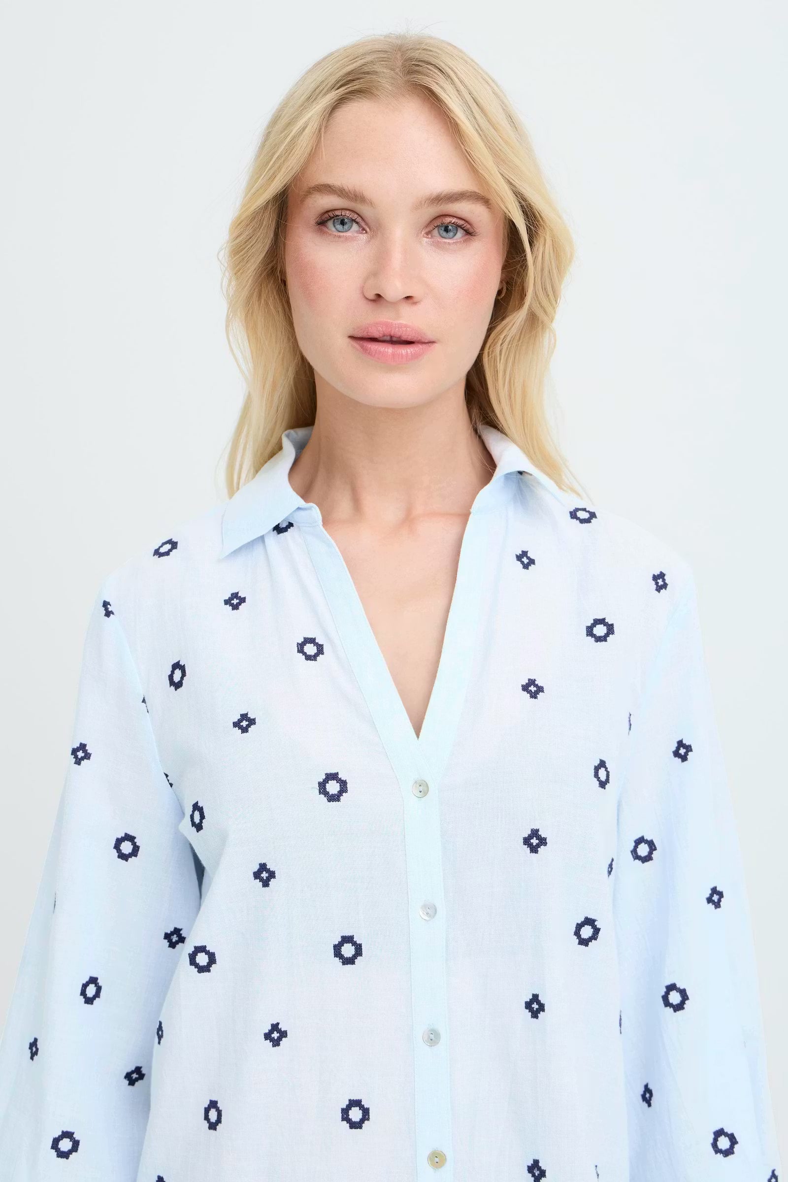 This embroidered blouse features a straight silhouette with a slightly rounded, longer back hem. The design includes a pointed collar, V-neckline, and full-length sleeves with wide cuffs. The blouse closes with a button front.