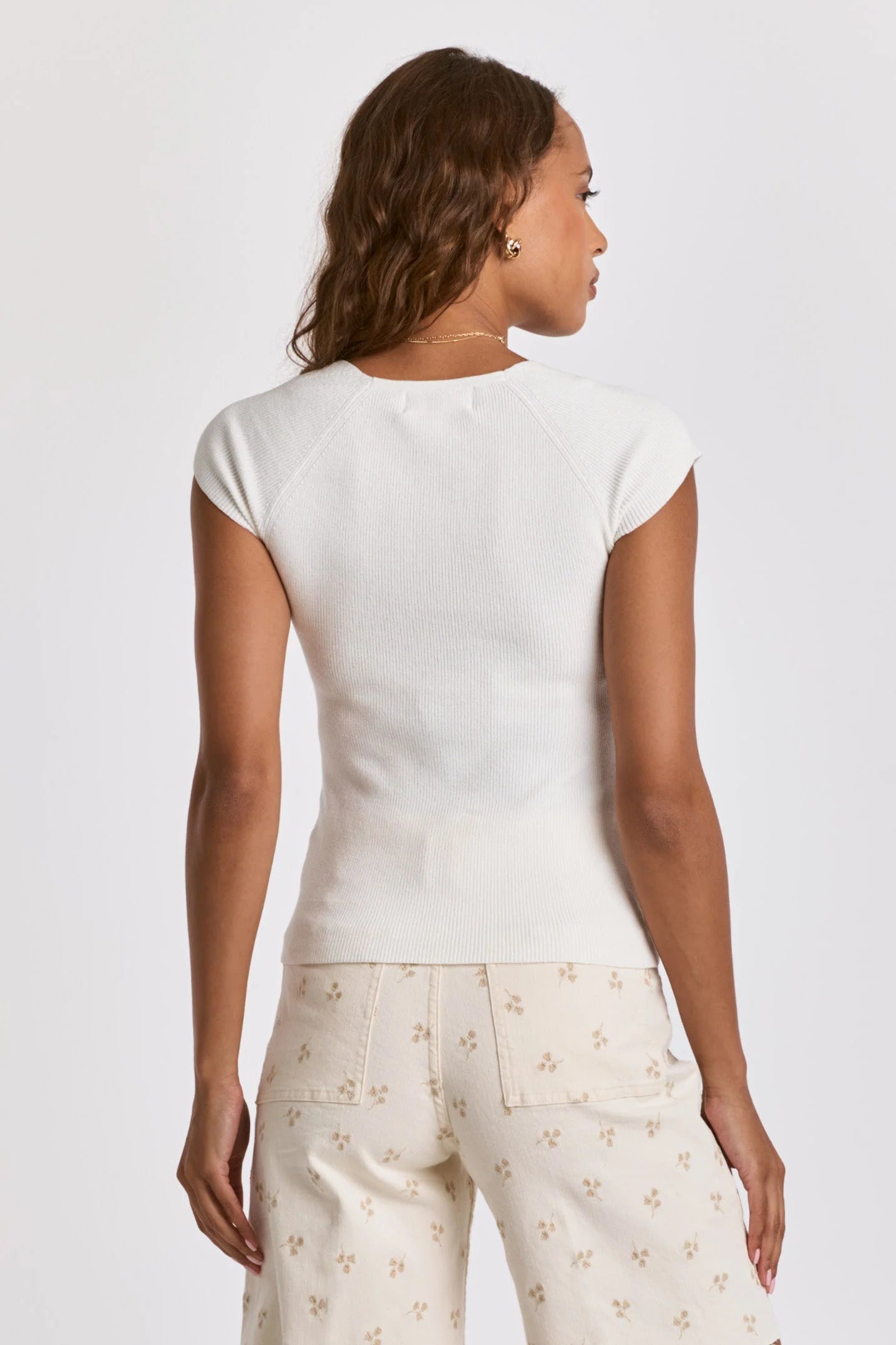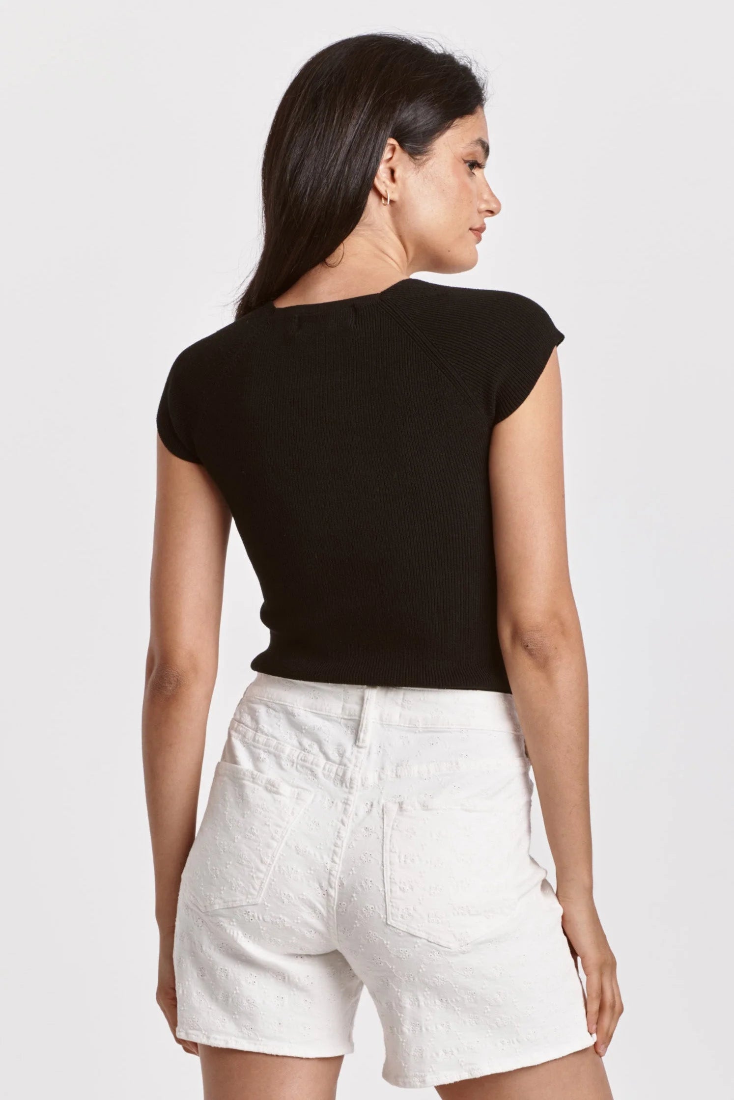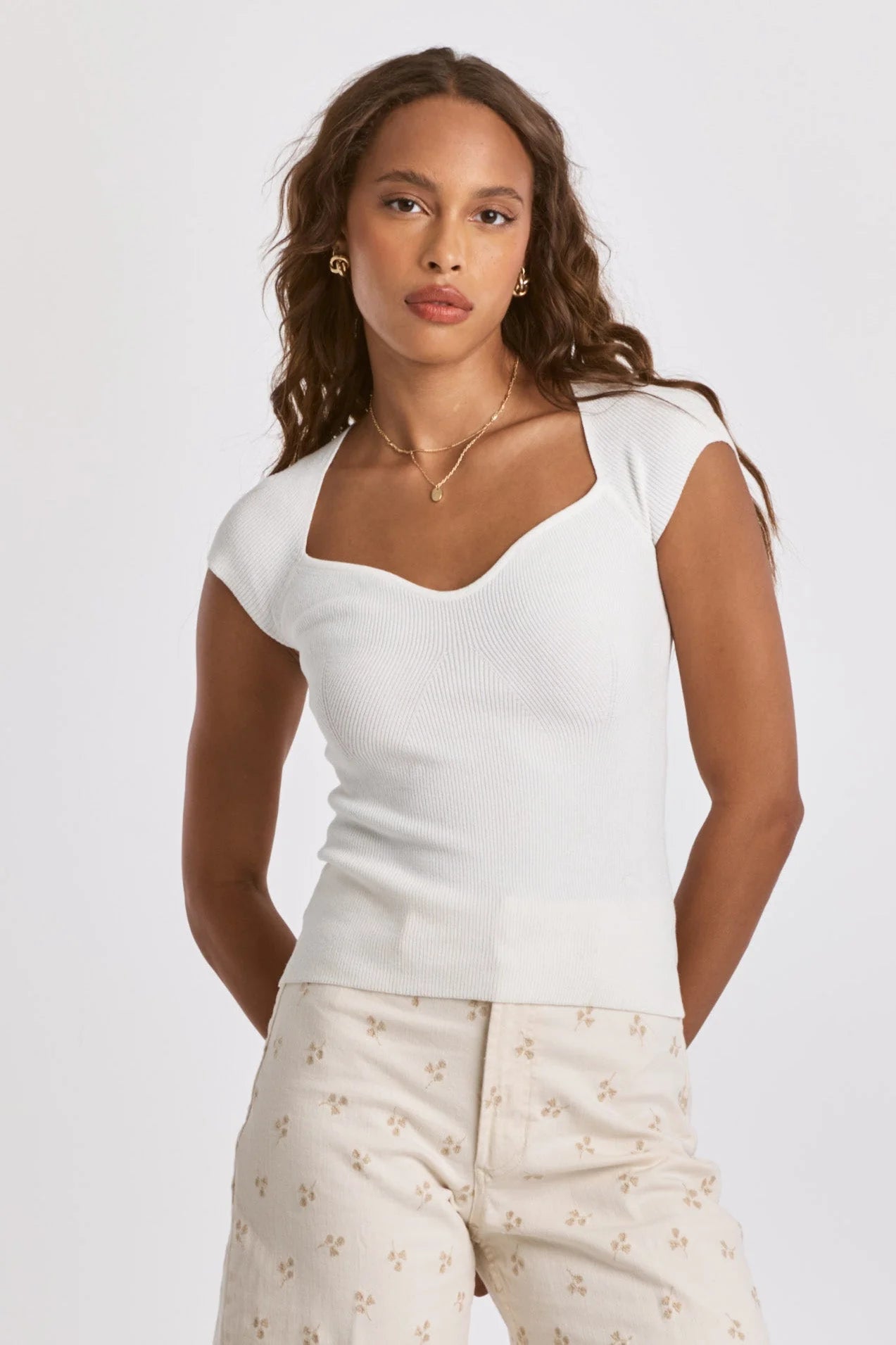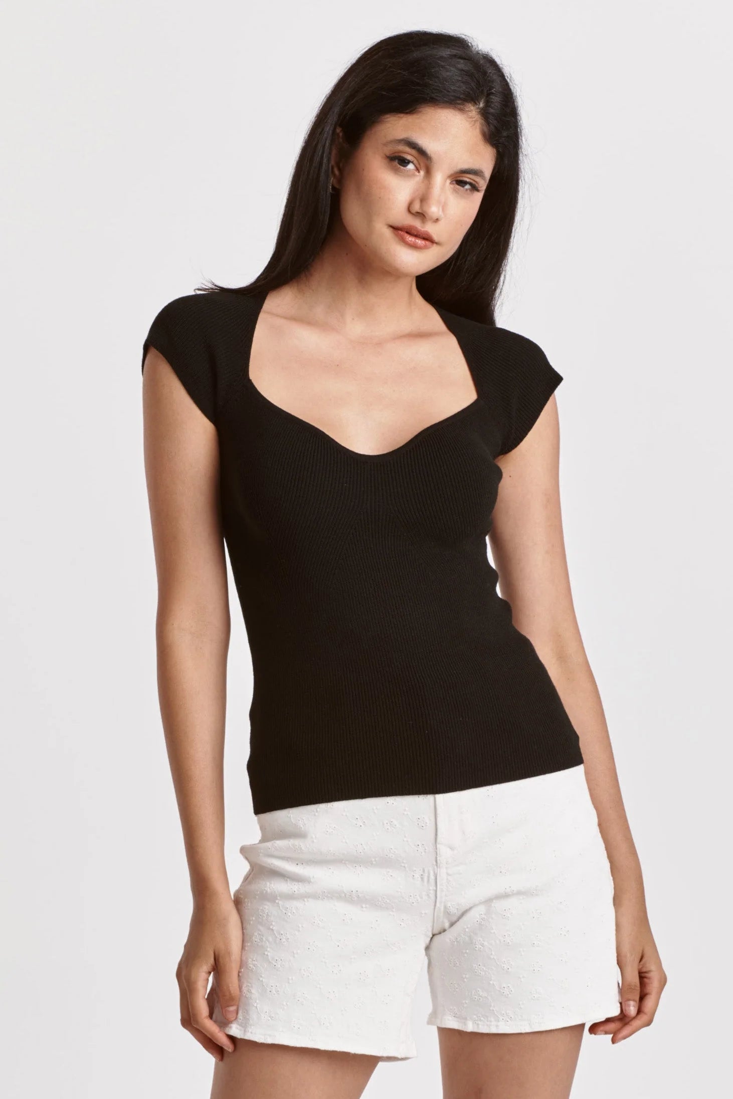 Sweetheart neckline top, stretch rib finished with cap sleeve. Solid color knit fitted. Sweet charm in soft & cozy rib, the perfect blend tailored for you being you...