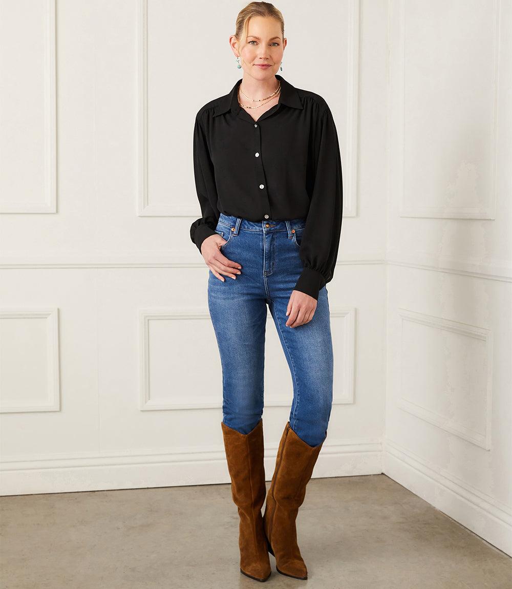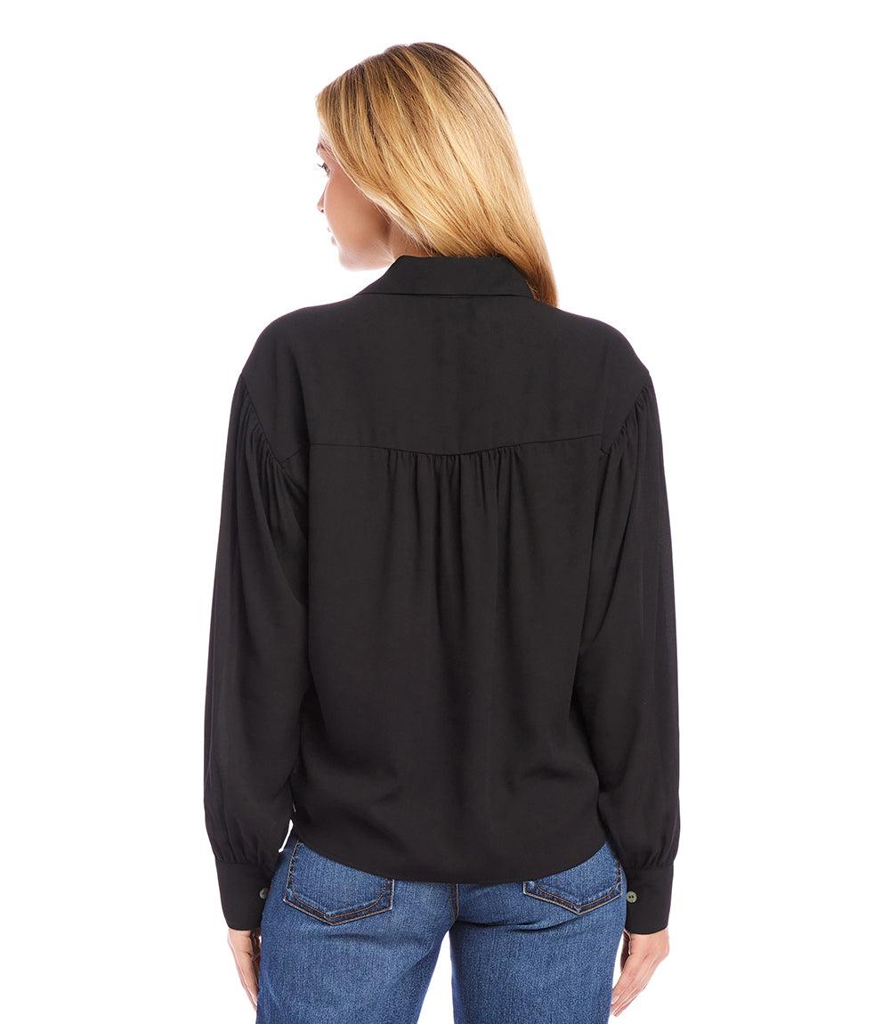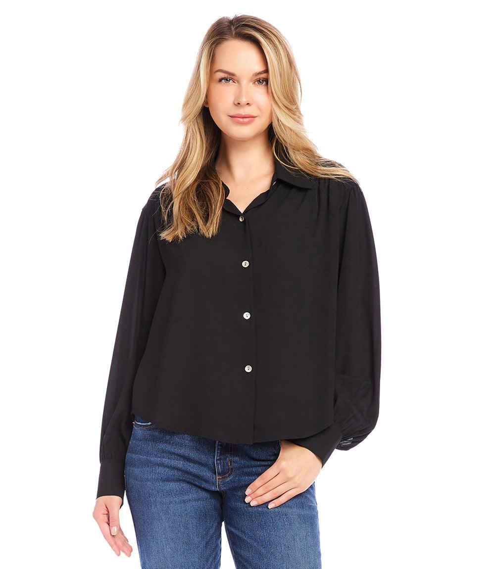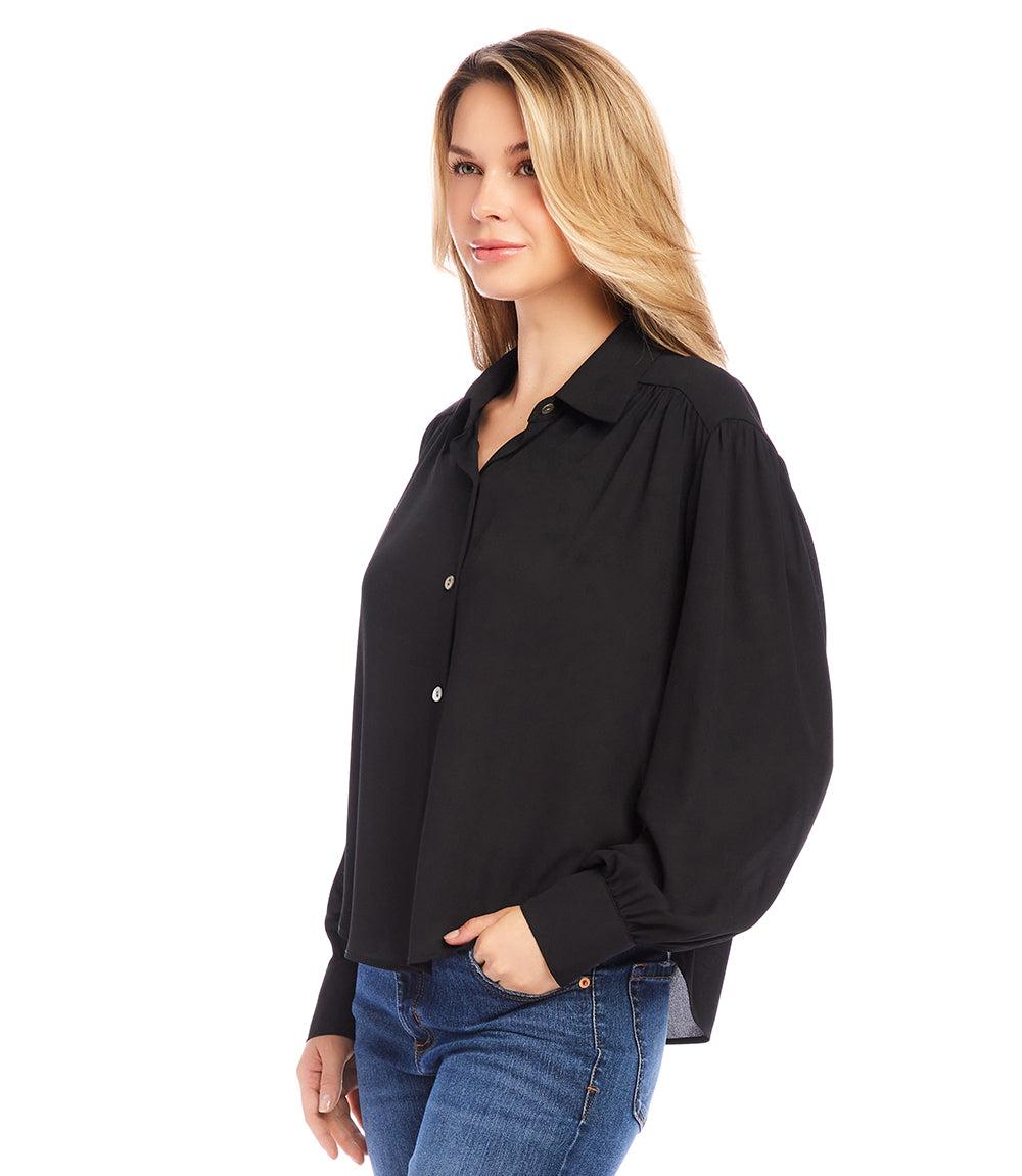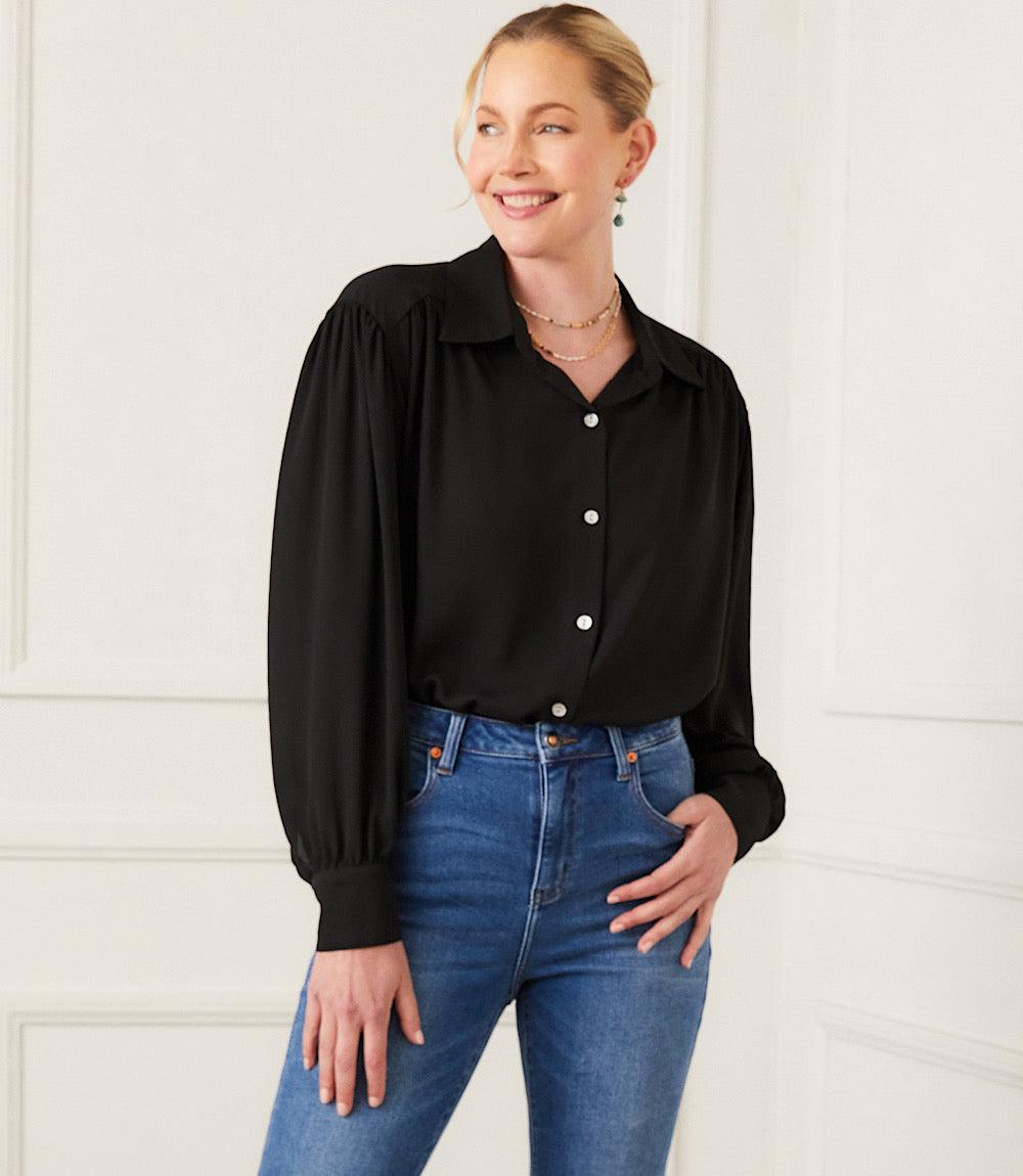 Elevate your wardrobe with the Dropped Shoulder Blouse. Made from silky crepe material, this blouse features a shell buttons and a shirring detail for a sophisticated touch. Perfect for day or night