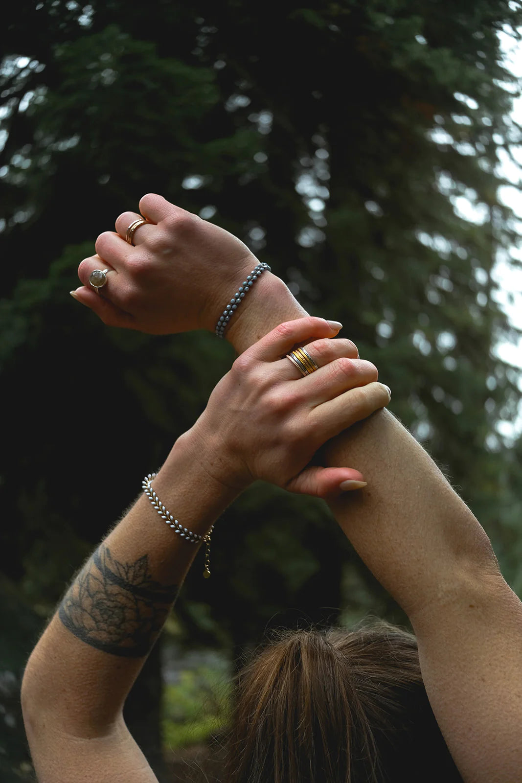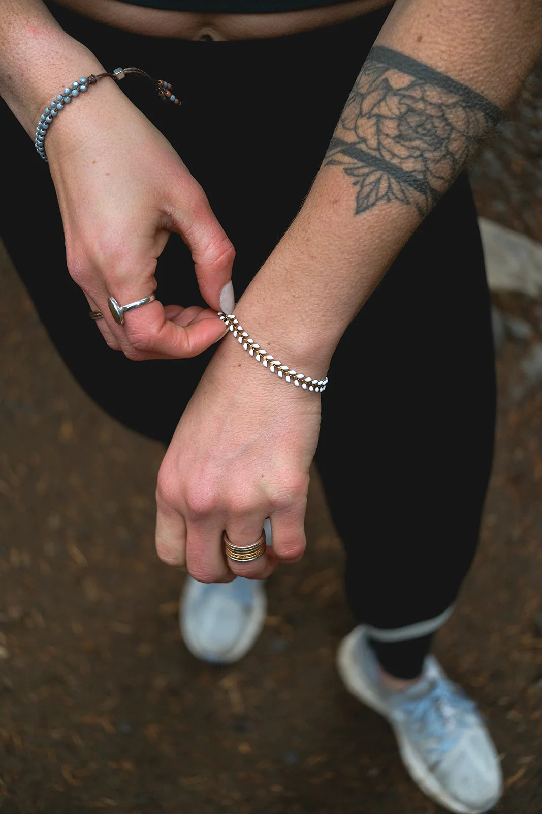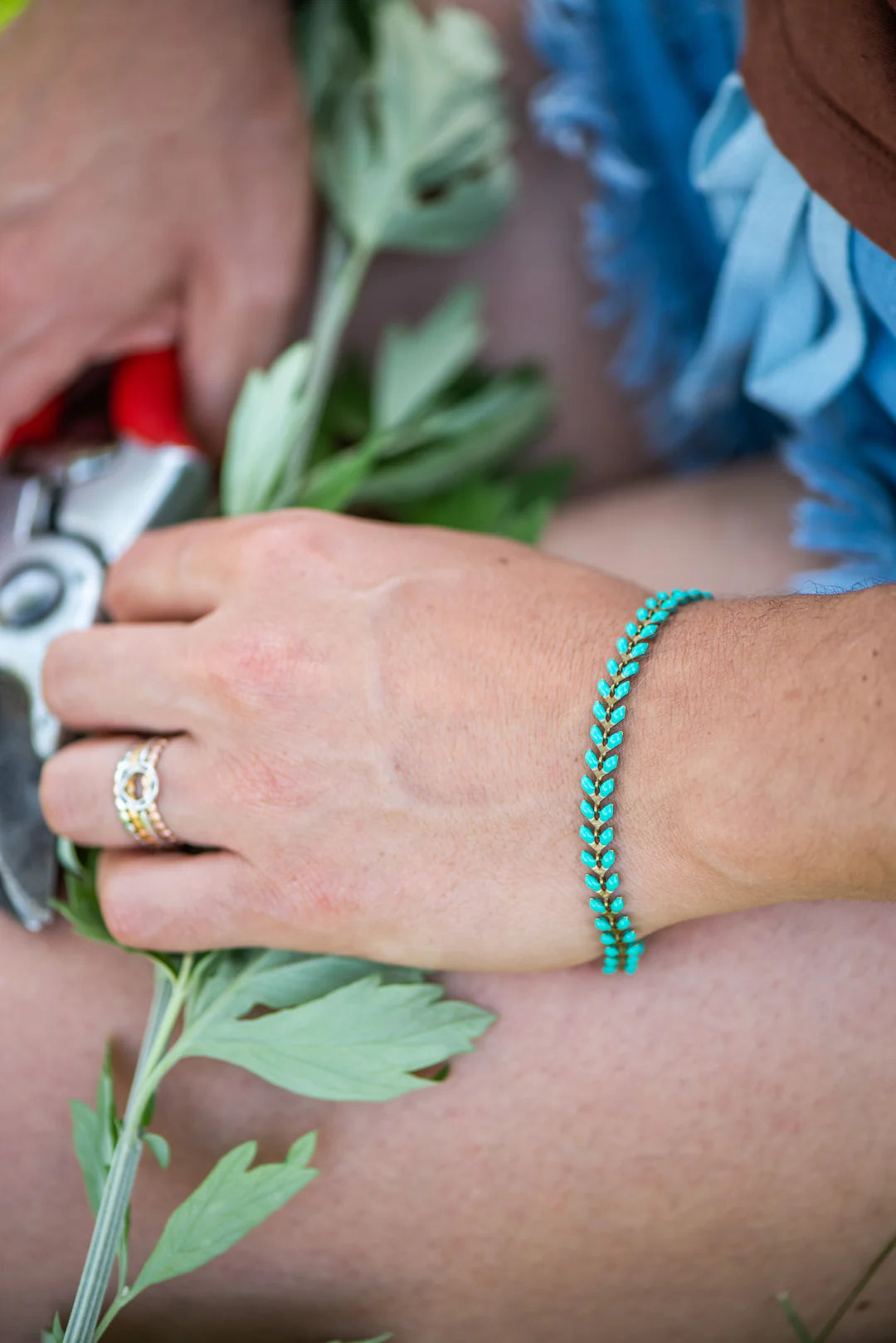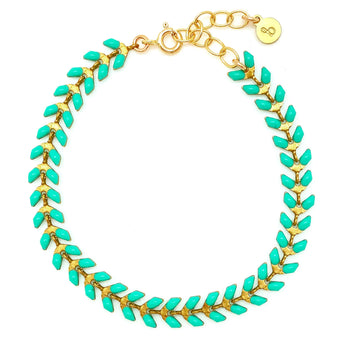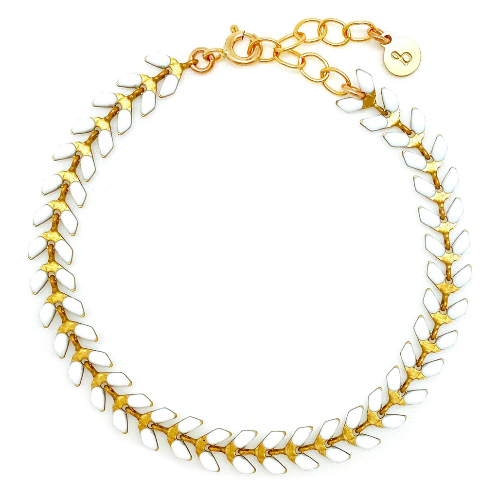 Say Hello to the newest in the Cascade Collection! This Enameled Cascade Bracelet is practical, sophisticated and completely beautiful. Feather-light, so comfortable, with a chevron shape that is modern and timeless. Available in Aqua or White with an adjustable extender chain and clasp closure. Looks lovely paired with other bracelets or stands strong alone as well. We hope you love this newest colorful addition as we do!