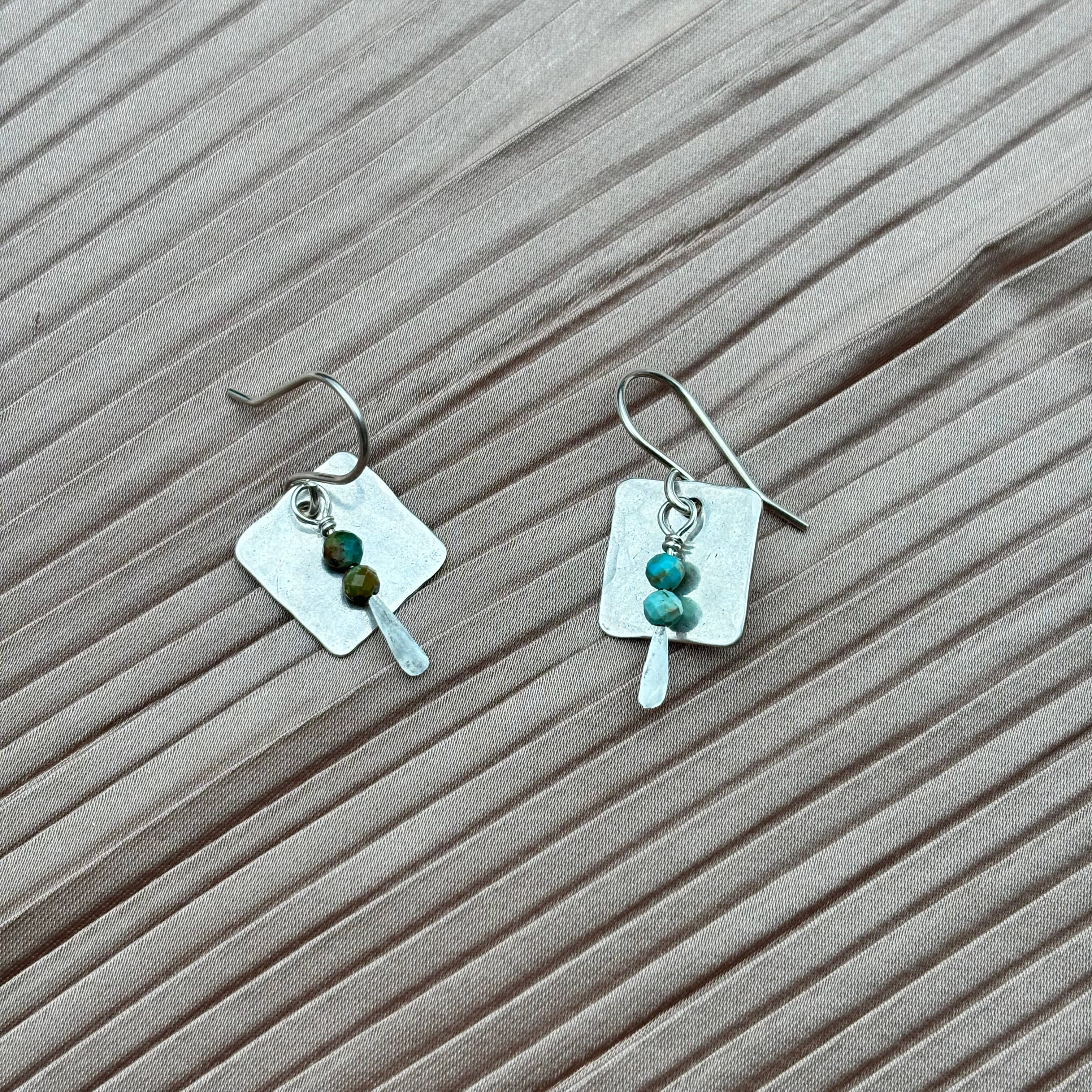 Gold or silver square pendants with turquoise, garnet, or jade stones.