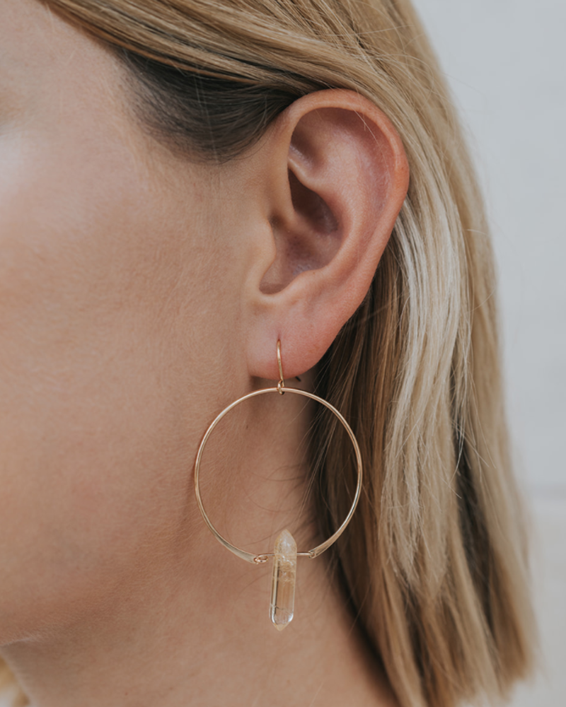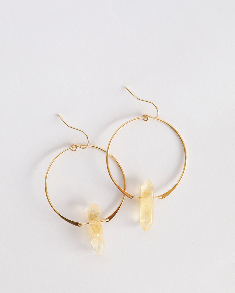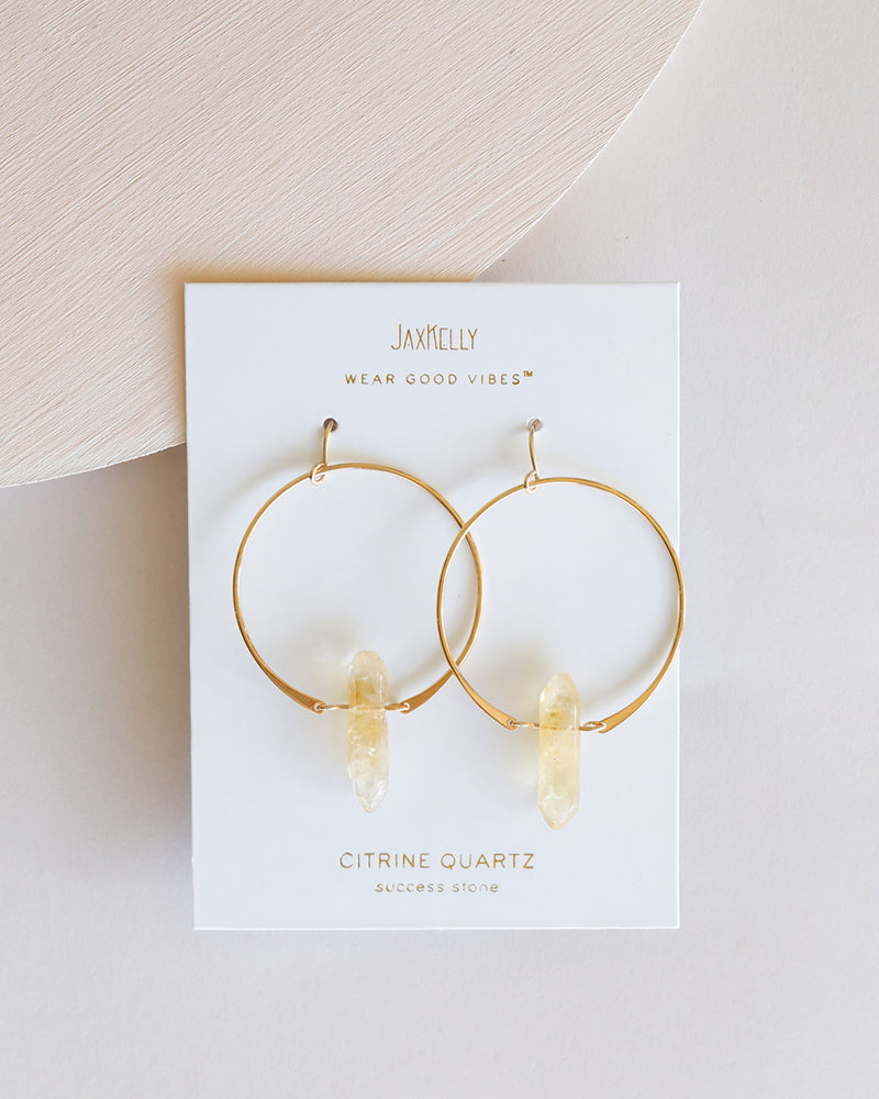 These double-pointed crystal earrings are handcrafted using a polished gemstone that is roughly 1" x 0.25" wide. Natural stones will vary in color and size.