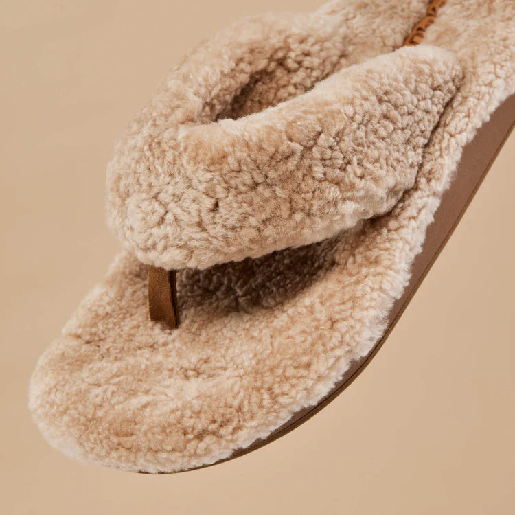 Part slipper. Part sandal. Pure softness. Our Kīpe‘a Heu is wrapped in fuzzy shearling. For the wāhine (women) who want to wear their OluKai slippers year-round, we designed the Kīpe'a Heu. Our commitment to comfort inspires this fluffy, genuine, shearling-wrapped sandal. They're so soft, you won't want to take them off. And thanks to a durable rubber outsole, you won't have to.