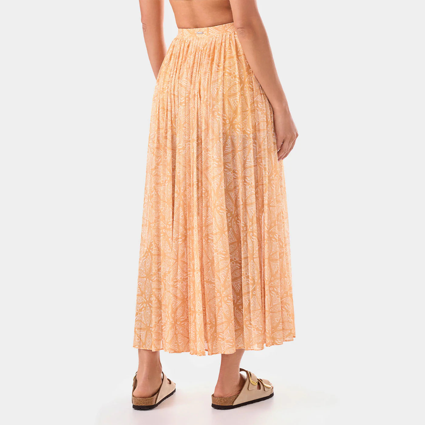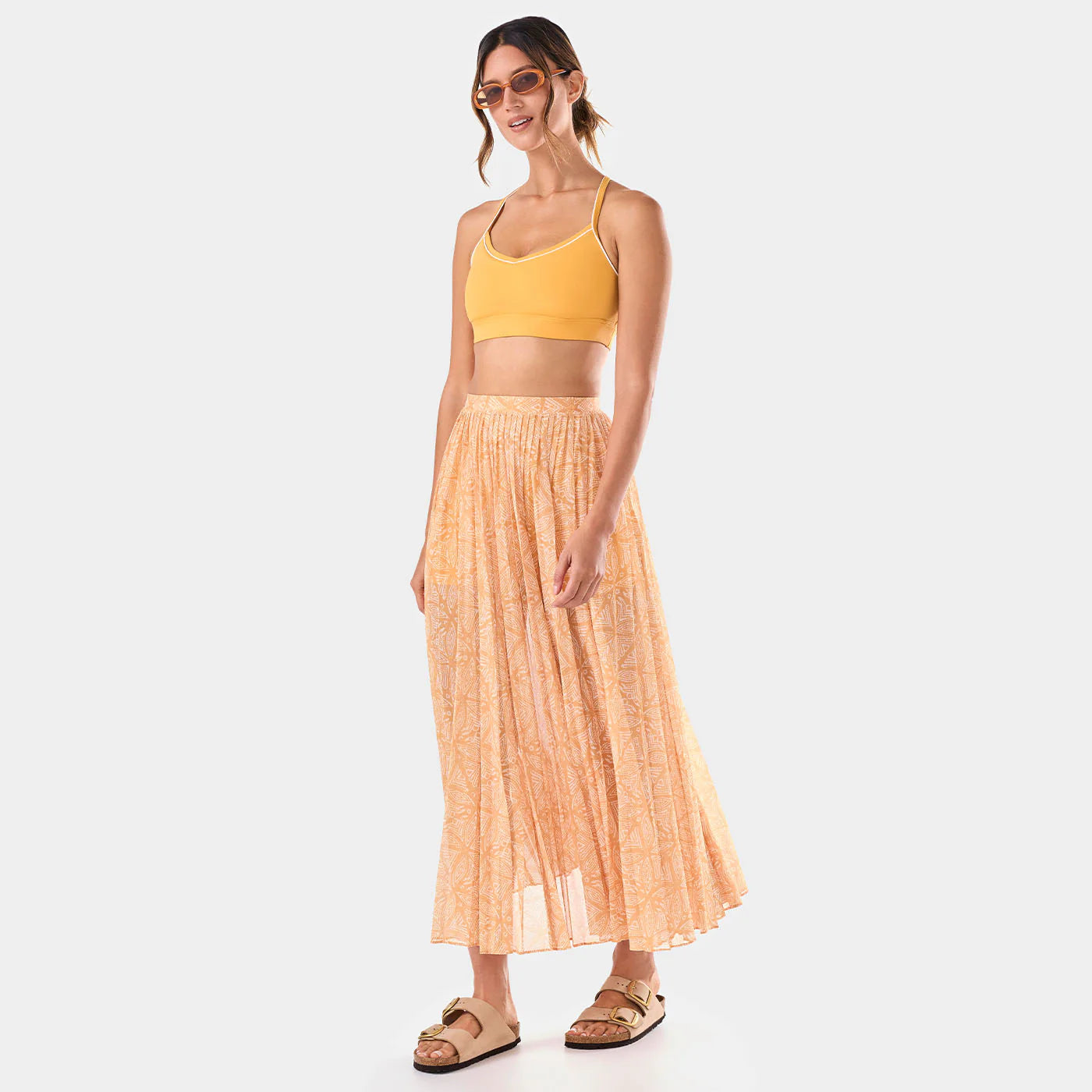 TAVI Pleated Active Coverup Skirt for studio to street, resort, poolside, beach and beyond. Delivers breezy movement in lightweight mesh tulle. Featuring an elastic waistband, full pleated design, and breathable fabric, this versatile layer is lightens up any look.