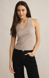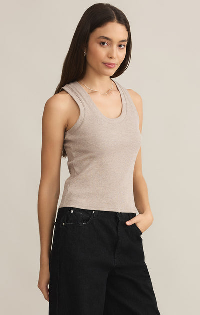 One of our most popular Essential tanks, made of our softly textured feather rib fabric, is a must-have whether worn on its own or as a fitted layer. We love this basic bra-friendly tank tucked or untucked.