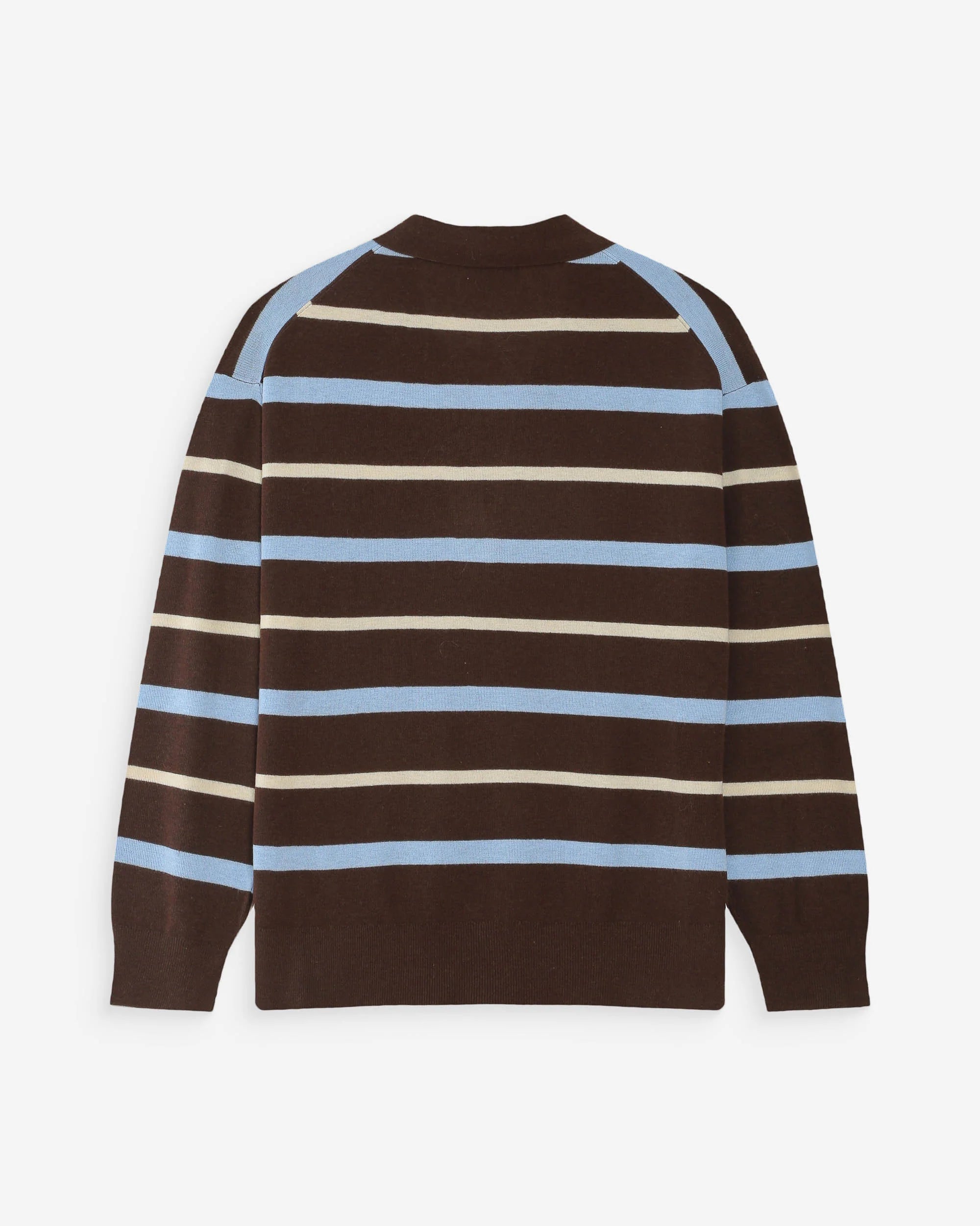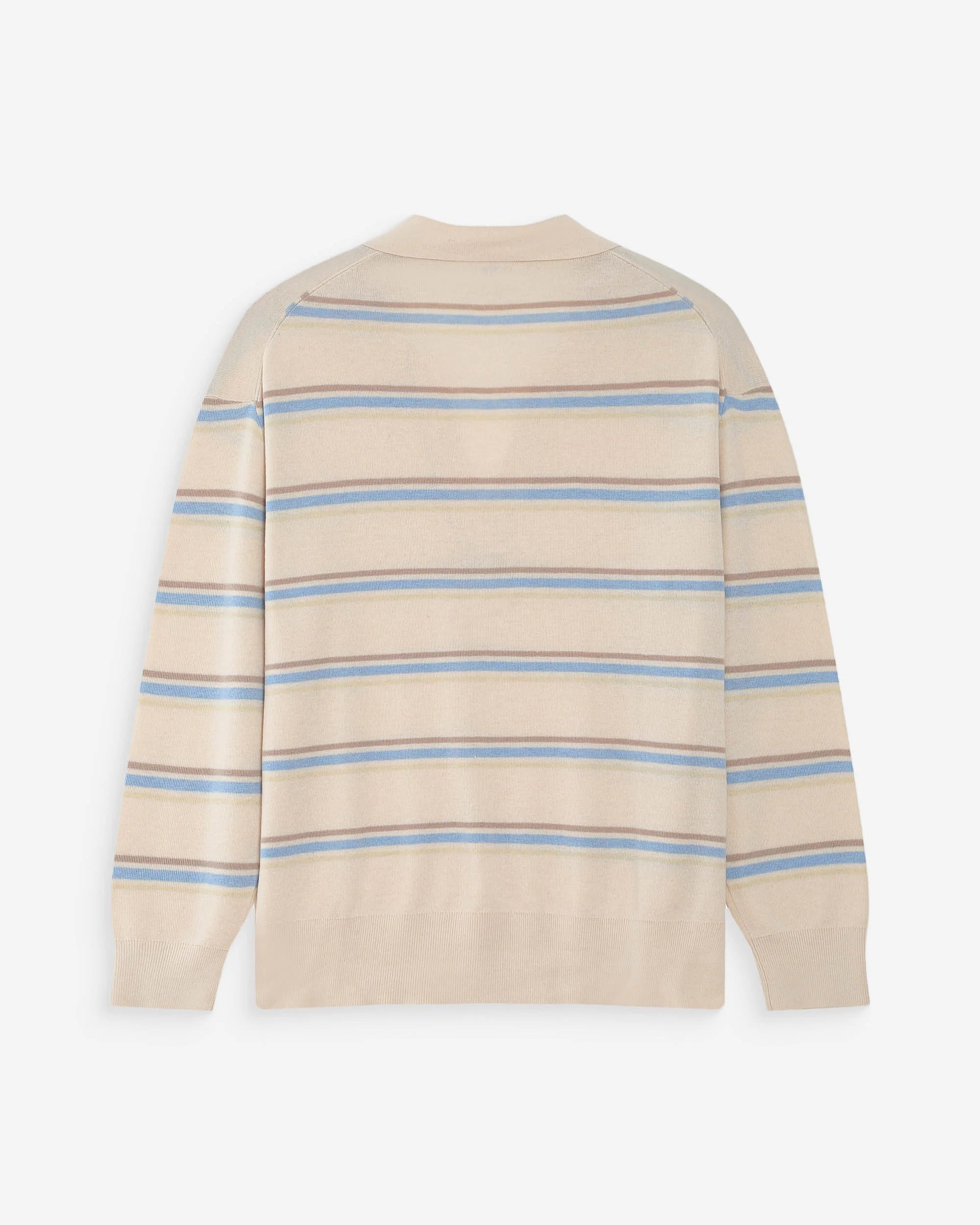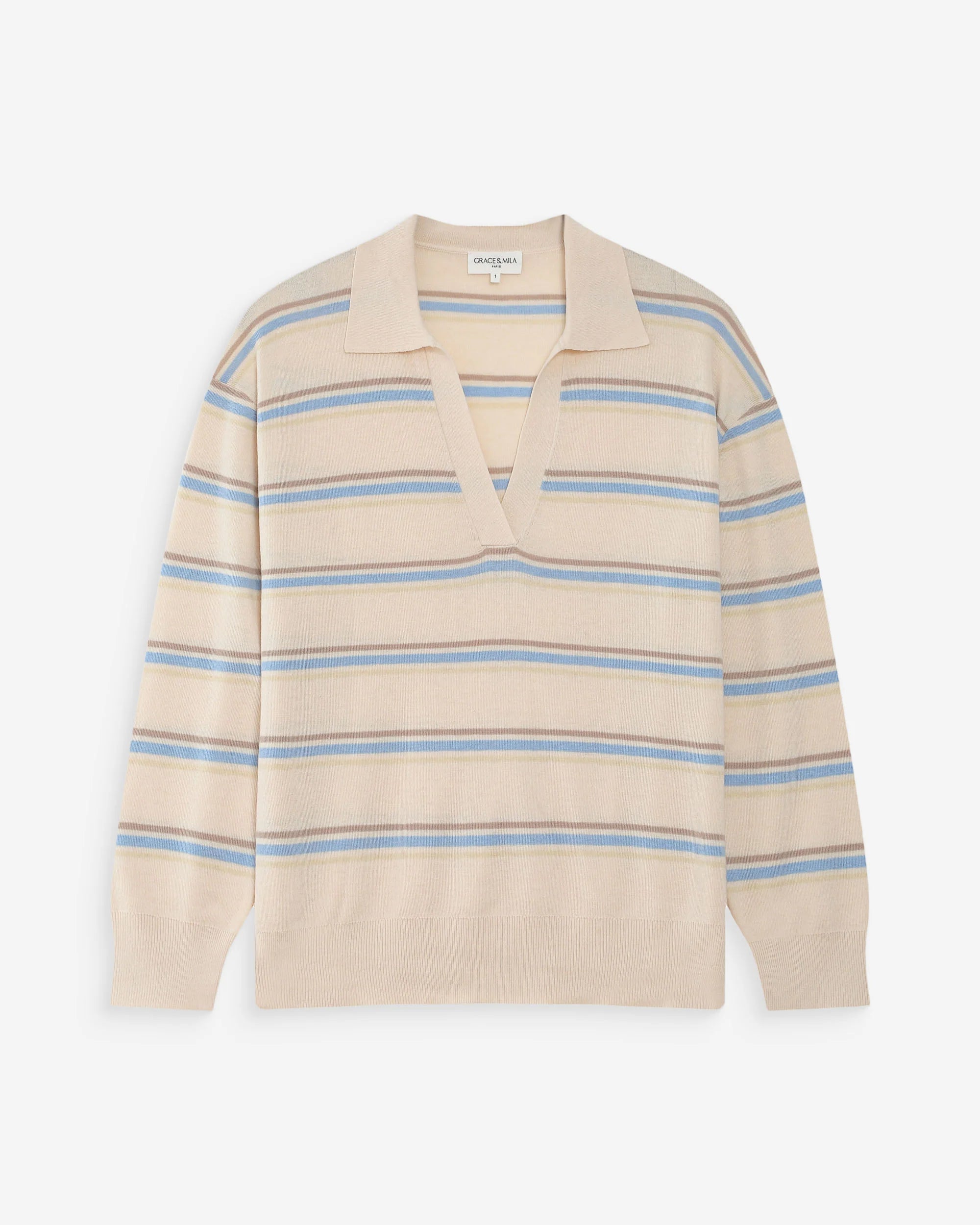 The VAPORETTO oversized sweater creates a relaxed and timeless look. The polo collar and long sleeves are paired with a fine knit, blending silk and wool, for a chic and effortless silhouette. The VAPORETTO long-sleeve sweater, available in solid or striped versions, features ribbed finishes at the cuffs and hem that subtly structure the silhouette.